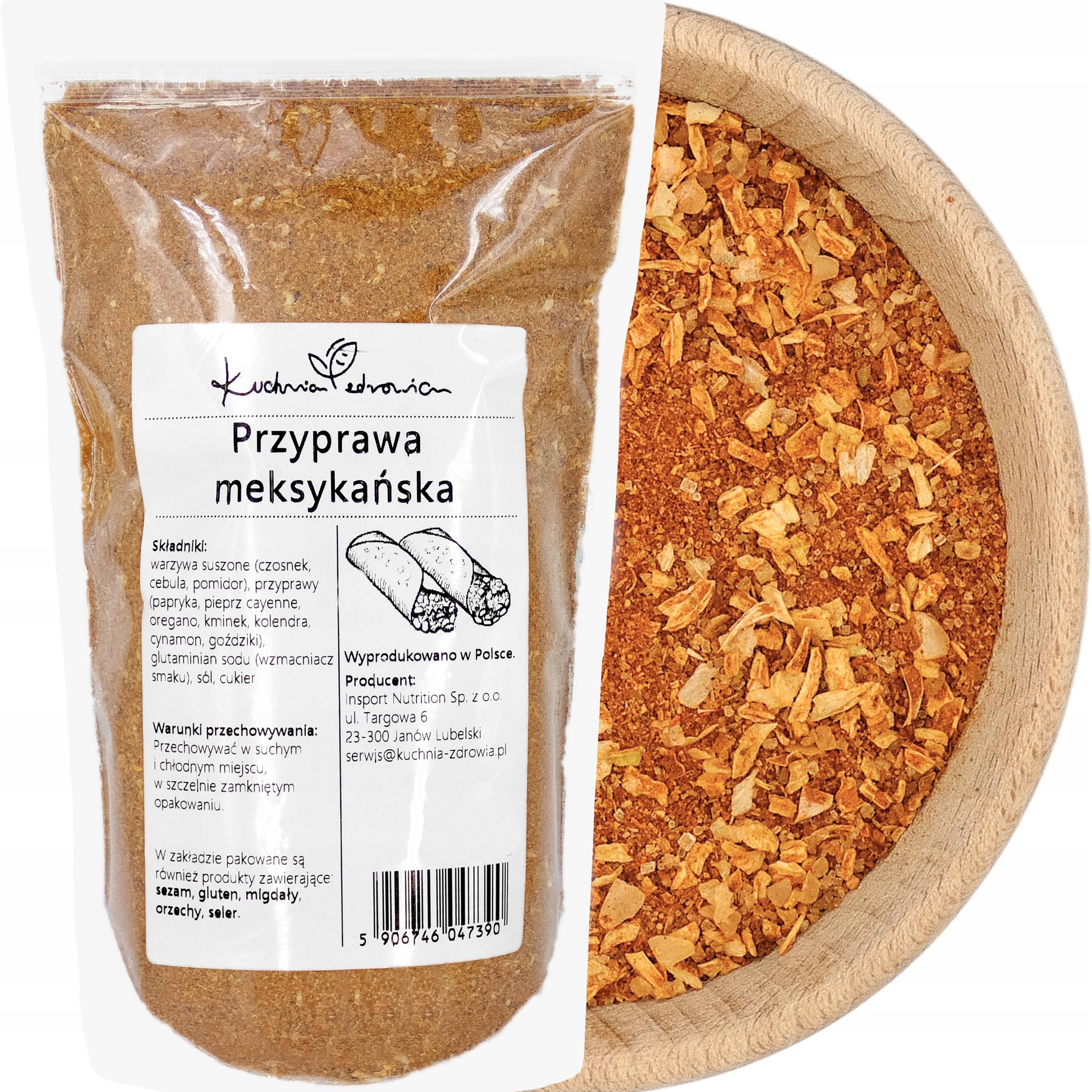 ? Discover the authentic flavor of KUCHNIA ZDROWIA's Mexican Spice Blend! This aromatic Mexican blend is the perfect combination of dried vegetables and spices, ideal for preparing Mexican dishes such as tacos, burritos, chili, and many more! The blend contains dried vegetables like garlic, onion, and tomato, combined with a variety of spices and herbs such as paprika, cayenne pepper, oregano, cumin, coriander, cinnamon, and cloves, which bring a rich and spicy flavor to all your dishes. Add this blend to your favorite recipes for an intense aromatic experience, with an extra kick from monosodium glutamate (MSG), which enhances the flavors. Our spice blend is naturally free of artificial additives and is carefully packaged to preserve its freshness. Caution: This product contains monosodium glutamate (MSG) and is packaged in a facility that also processes sesame, almonds, gluten, and other tree nuts. This Mexican spice blend is perfect for those seeking an authentic and healthy culinary experience. Enhance your dishes with this natural and flavorful mix! Ingredients: dried vegetables (garlic, onion, tomato), spices (paprika, cayenne pepper, oregano, cumin, coriander, cinnamon, cloves), monosodium glutamate (flavor enhancer), salt, sugar. Safety Warning: Sesame seeds, almonds, gluten-containing products, and various nuts are also processed at the factory. Despite all efforts, the presence of these raw materials in the product cannot be completely ruled out. See more