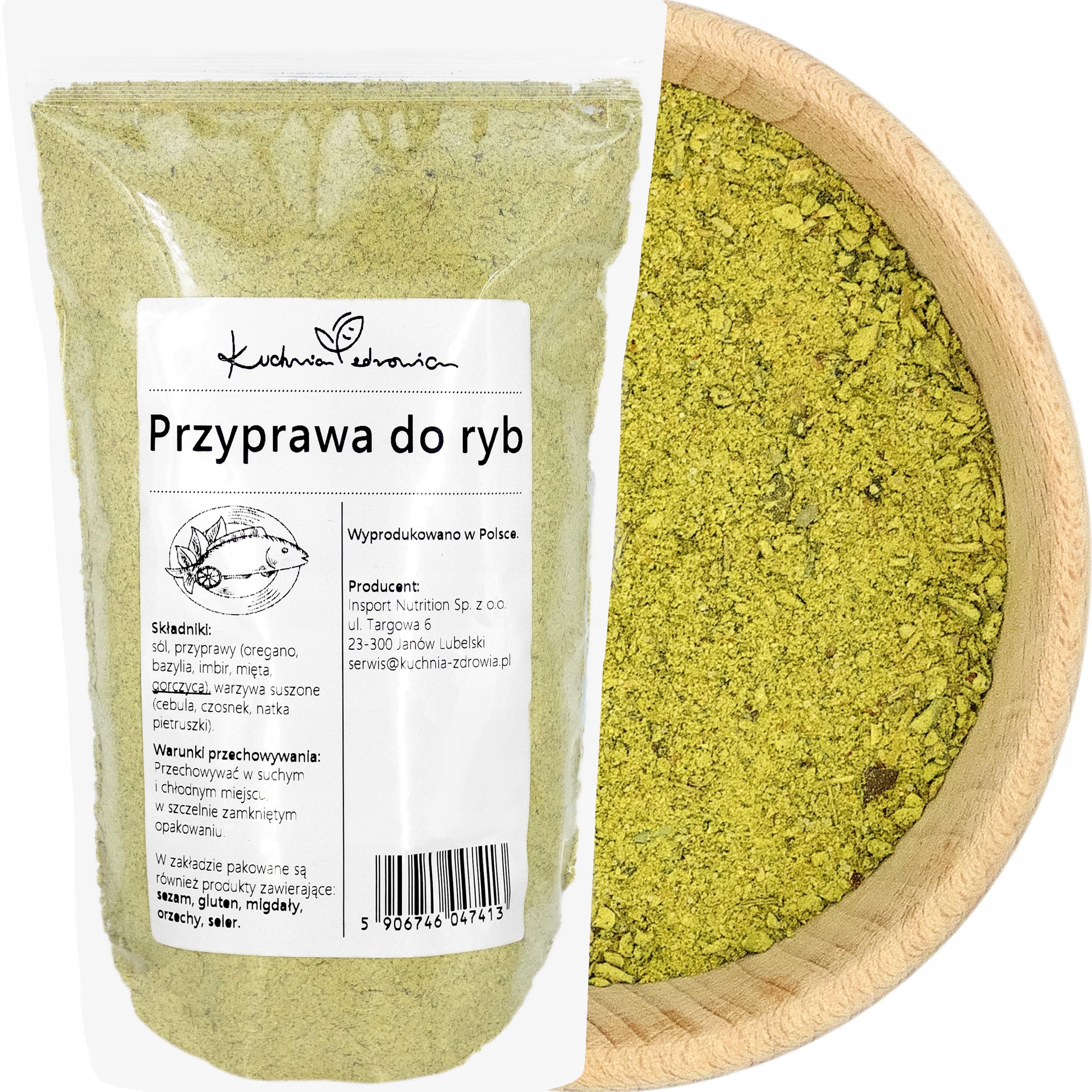 Add a touch of Mediterranean flavor to your fish dishes with our KUCHNIA ZDROWIA fish seasoning blend! Made with carefully selected ingredients, this blend combines salt, oregano, basil, ginger, mint, mustard, dried onion and garlic, and dried parsley – everything you need to elevate your recipes! Perfect for grilling, baking, or marinating, just a pinch is all it takes to transform a simple dish into a true feast. Ingredients: Salt, oregano, basil, ginger, mint, mustard, dried onion, dried garlic, dried parsley. Safety Warning: The factory also uses: sesame, celery, mustard, almonds, products containing gluten, and various nuts. Despite our best efforts, the presence of these ingredients in the product cannot be 100 ruled out. See more