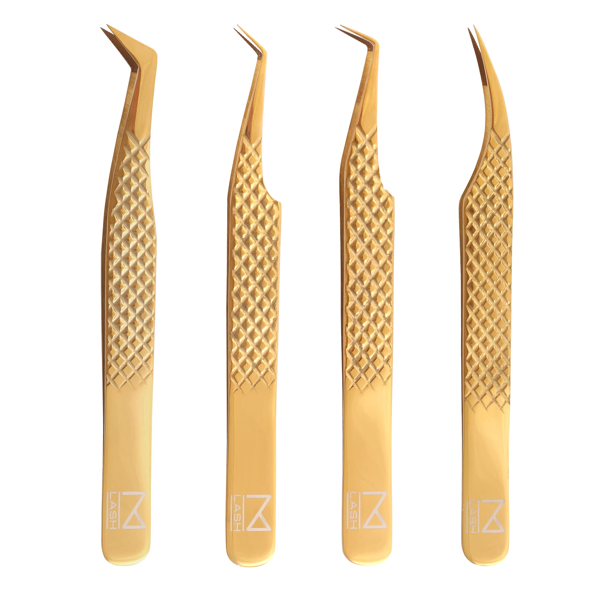 fiber, allowing for precise and effortless lash pickup, ensuring a flawless application every time. Perfect for Professional Use: These tweezers are designed specifically for professional use in eyelash extensions, providing the perfect tool for every lash application. High-Quality Japanese Steel: Our M LASH V5 set of 4 tweezers with