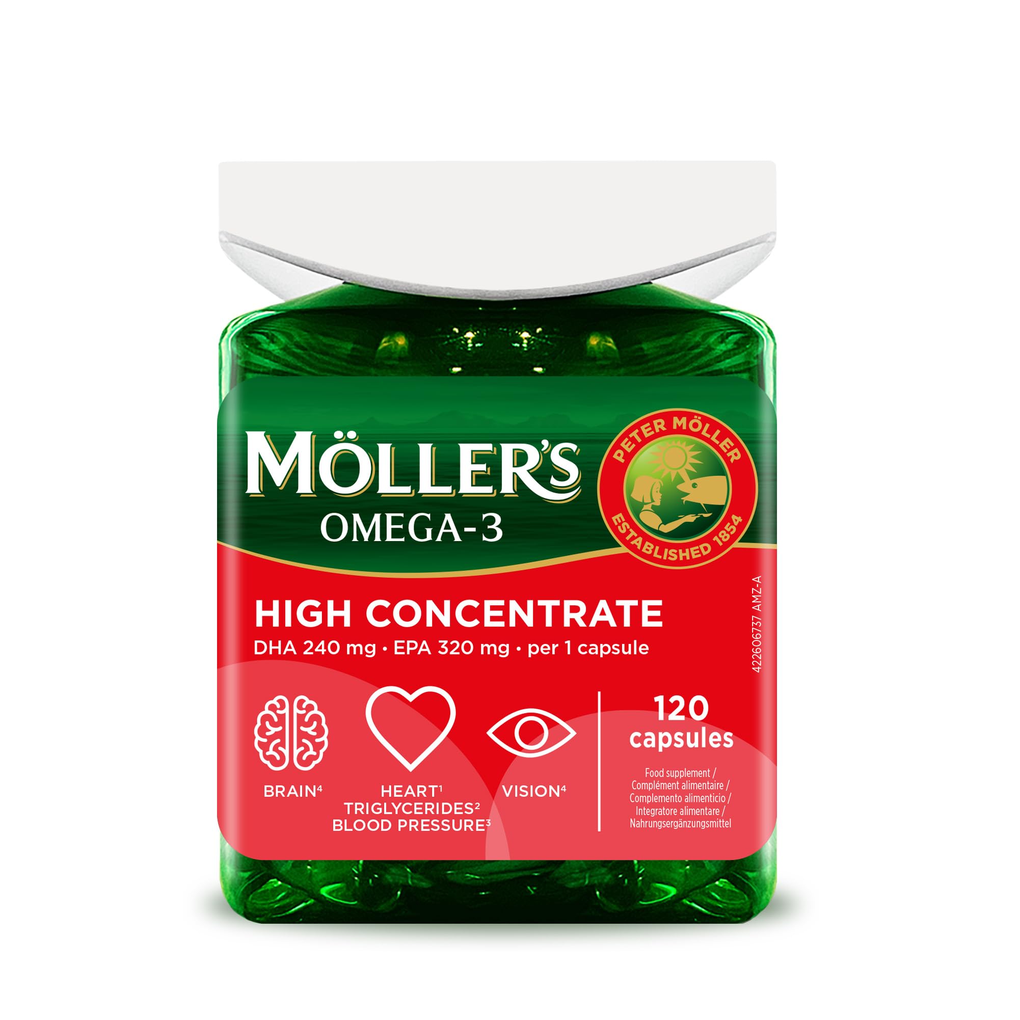 Möller's Omega-3 Cardio is a food supplement in softgel capsules containing concentrated fish oil, rich in the omega-3 fatty acids EPA and DHA, which have a proven beneficial effect on heart health. Just one capsule a day provides 250 mg of EPA and DHA to support normal heart function. Higher doses (up to 6 capsules) further contribute to maintaining normal blood triglyceride levels and normal blood pressure. A sustainable product, awarded the Friend of the Sea certificate. INGREDIENTS Concentrated fish oil (triglycerides), food-grade gelatin (beef) humectant: glycerin antioxidant: tocopherol-rich extract. SAFETY WARNING Please follow these instructions for safe use: 1. Storage: Store at room temperature, in a dark place, and out of reach of young children. 2. Recommended daily intake for adults: 2 to 6 capsules. The recommended daily dose should not be exceeded. Food supplements should not be used as a substitute for a varied and balanced diet and a healthy lifestyle. A total daily intake of 5 g of EPA and DHA should not be exceeded. 3. Allergens: This product may contain fish allergens. People with fish allergies should not take this product. 4. Pregnancy and breastfeeding: Pregnant or breastfeeding women should consult their doctor before using this product. 5. Side effects: In case of adverse reactions or allergy symptoms, stop taking the product immediately and consult a doctor. See more