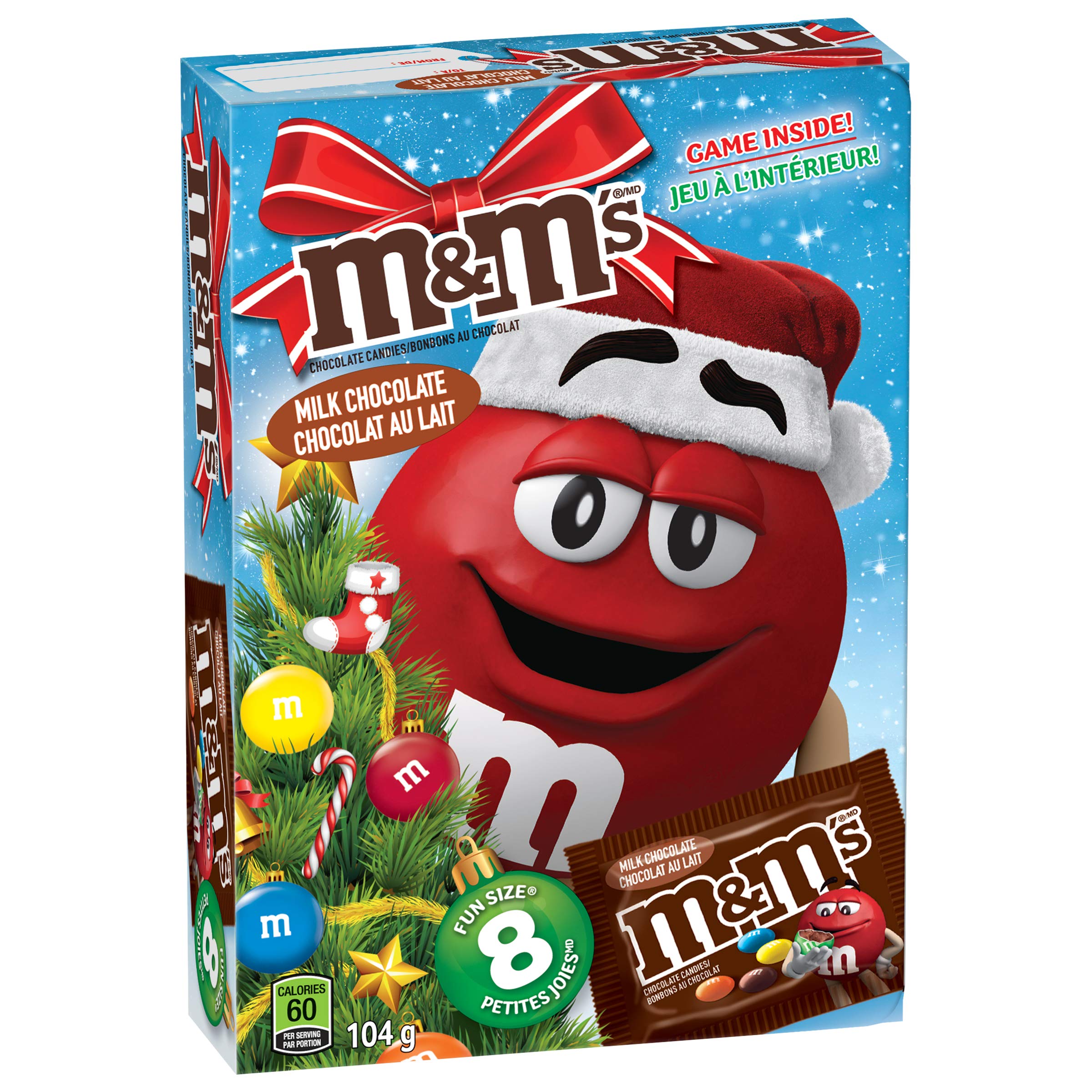 Give coworkers, party hosts and friends a tasty chocolate gift this holiday. Festive candies are great for stocking stuffers and teacher gifts. M&M'S Milk Chocolate Candy is all dressed up for the holidays in red and green colours. Enjoy 8 fun size M&M'S Milk Chocolate Christmas Candy packs in a decorative box with a fun game and Christmas story. Contains one (1) 104g of M&M'S Milk Chocolate Fun Size Candy Christmas Storybook Christmas Gift.