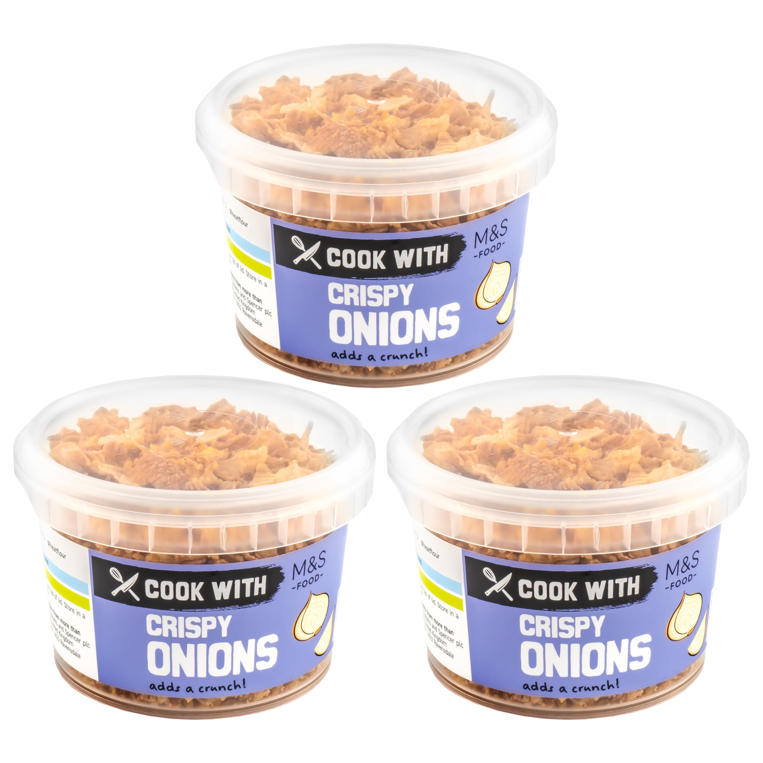 Set of 3 x 100g tubs. Perfect for adding a crunch to savoury dishes. Suitable for vegetarians. INGREDIENTS Onions (75%), Palm Oil, Wheatflour (contains Gluten), Salt