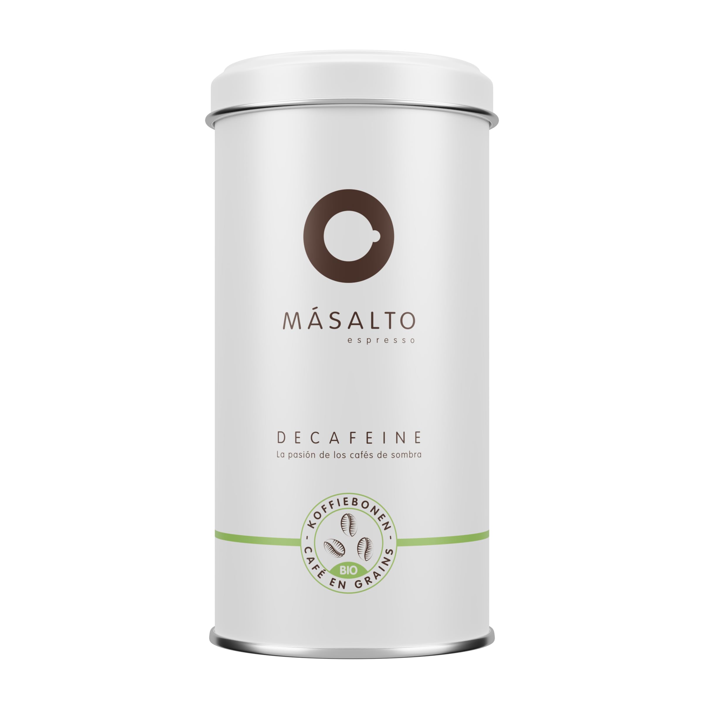 Másalto Organic Espresso Decaffeinated Coffee Beans: Decaffeinated and Beyond. Másalto's Organic Decaffeinated Coffee Bean Blend, grown on chemical-free land, is composed of specialty coffees from three exceptional origins, each rated between 82 and 87 by expert Q-Graders. The purity of the product is guaranteed by avoiding any contact with non-organic coffee beans. The harvest is carried out by hand under the expert supervision of local farmers and with the utmost respect for the environment. After artisanal roasting in Belgium, the coffee is rendered caffeine-free using a natural method, thus preserving the aromas of vanilla, rose tea, and coffee blossom. Responsible Enjoyment. Másalto Organic Decaffeinated Espresso Coffee Beans are suitable for all brewing methods and offer a responsible choice for lovers of high-quality coffee. Using a metal tin not only guarantees the preservation of quality and freshness, but is also a sustainable option, as metal is 100 recyclable. With Másalto, you not only enjoy excellent coffee, but you also contribute to a greener future.