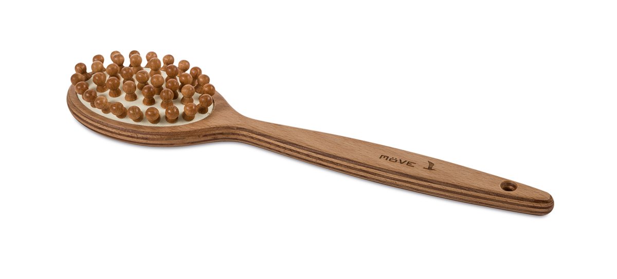 The Möve Beech Plywood collection The Möve Beech Plywood brushes made of beech stratwood - a massage brush with wooden knobs and a bathing brush with natural bristles - complete and complement the Möve BadaCessories.The long grip and the incorporated hanging option make the carefully processed brushes a practical companion in the Bad and Sauna.They are ideal for cleaning/ massage and stimulating the blood flow to the skin. Set contains: Please avoid a massage brush