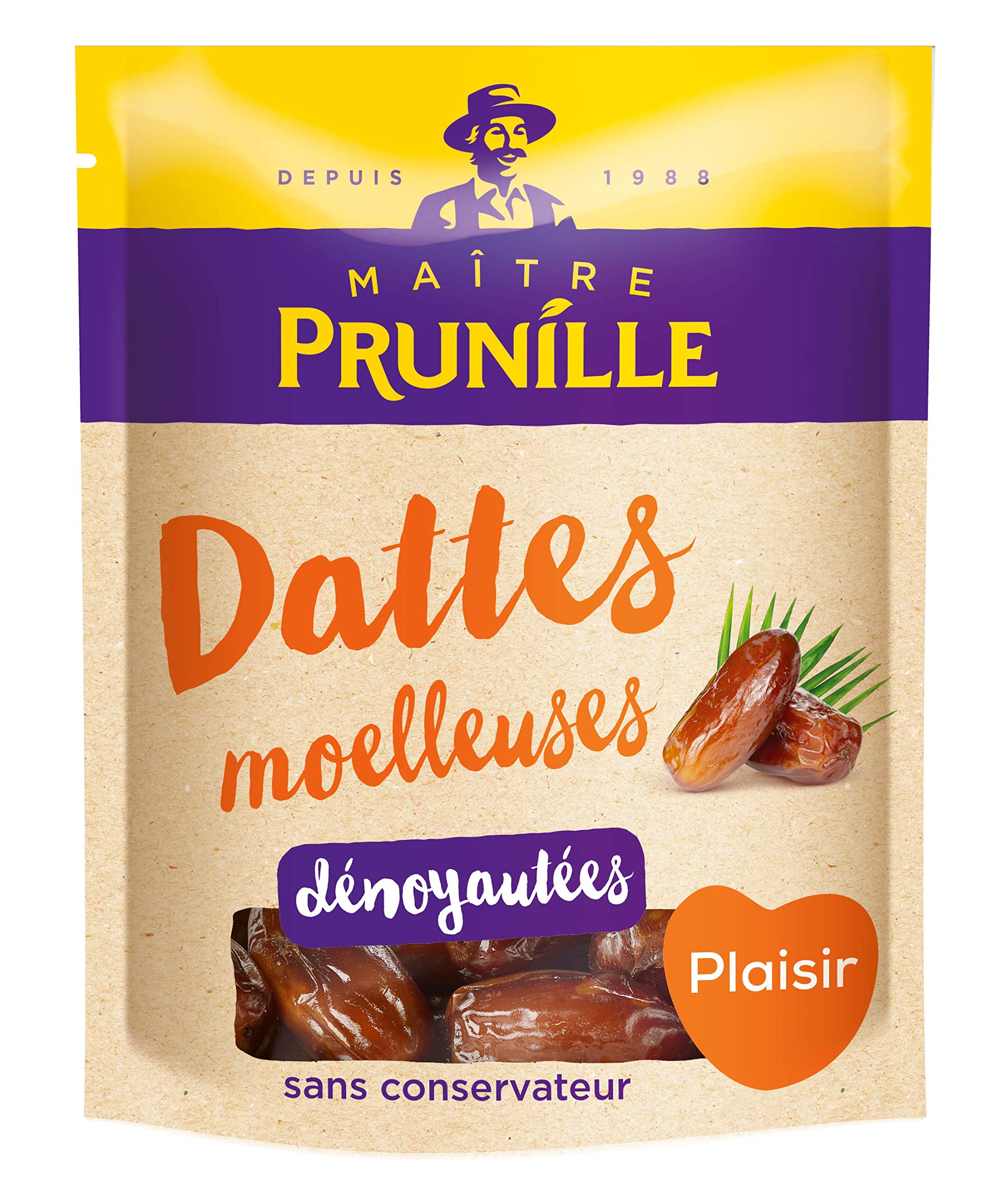 MASTER PRUNILLE'S EXPERTISE: Since 1988, Maître Prunille has been offering high-quality dried fruit. Its exacting standards have made it a European leader in the prune and nuts market. A COMMITTED PLAYER: Maître Prunille offers safe and traceable products that meet the challenges of sustainable development. The man in the hat is also committed to the vitality of the local community. HEALTHY SNACK: Dates can be enjoyed at any time of day: in the morning at breakfast, at lunchtime with coffee, in the afternoon for a healthy snack, and in the evening for a sweet treat. PROMOTES DIGESTION: Rich in protein, antioxidants, potassium, and magnesium, dates are also a very effective natural digestive aid that helps regulate bowel movements. A UNIQUE TASTE: Pitted Deglet Nour dates are a particularly prized variety. Its unique taste with hints of caramel, its firm yet melting texture will surely win you over.