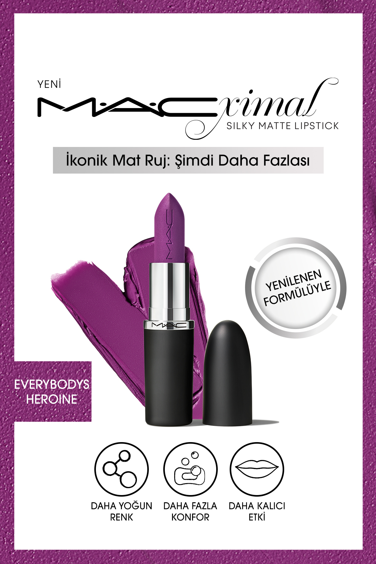More for Your Lips: The Renewed Iconic M A C Lipstick. The matte lipstick family, which has become iconic all over the world, has now been renewed to provide more intense color, more comfort and a more lasting effect to the lips with its formula that provides a silky matte finish. MORE INTENSIVE COLOR: Offers intensely pigmented full coverage with 40 different iconic and new trend color options approved by make-up artists. MORE COMFORT: It nourishes and cares for the lips thanks to the mixture of coconut oil, organic shea butter and organic cocoa butter in its formula. MORE CARE: Formula that moisturizes lips instantly and for up to 8 hours. MORE PERMANENT EFFECT: More visible true colors with its creamy formula that lasts up to 12 hours and provides intense color in one touch. MORE LUXURIOUS DESIGN: Feel more with every touch, from the special design to the rich formula! MORE SENSITIVE: Our iconic lipstick is made from at least 30 recycled materials, within the framework of our sustainability mission.