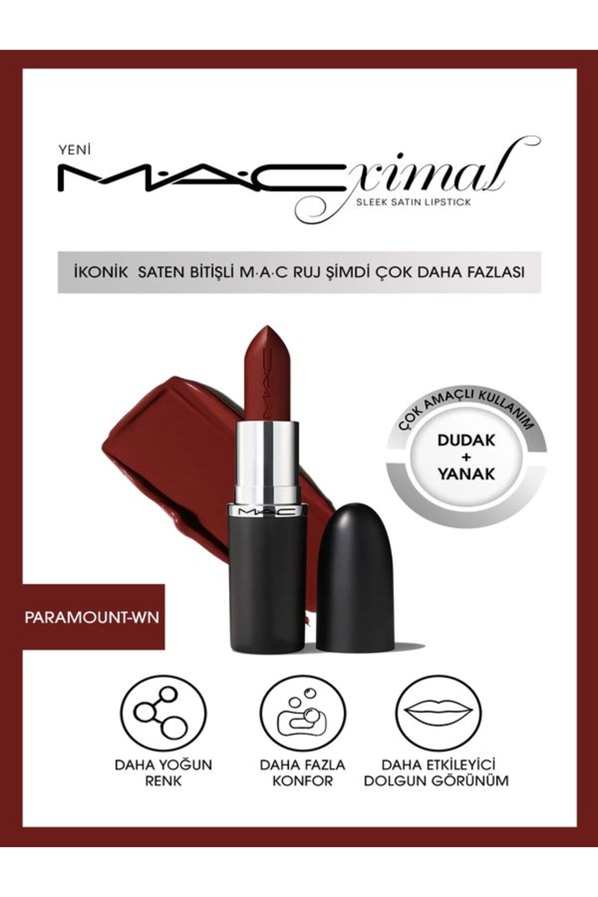 Yogun pigmentli tam kapaticilik sunan ve dudaklari sekiz saate kadar nemlendiren formülü, hareket halindeyken kullanima uygun boyutta lüks tasarimli saten bitisli M A C ruj