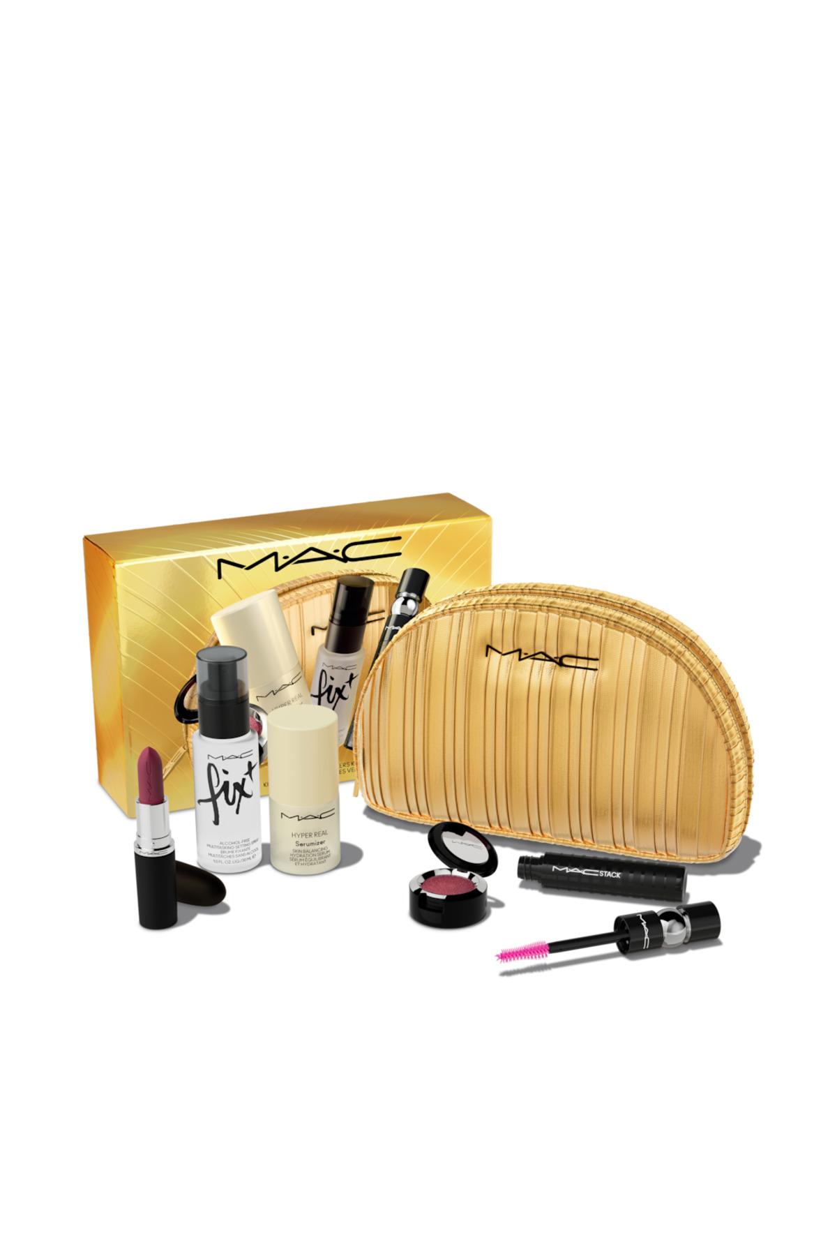 • Get ready to shine with this gold star-worthy five-piece limited edition gift set for flawless makeup! Featuring our products for eyes, lips, and skin, this set comes with the full-size M A Cximal Silky Matte Lipstick (Captive Audience), Dazzleshadow Extreme (Royal Ruby), M A CStack Mascara, Fix Mini M A C, and mini-size Hyper Real Serumizer™ Skin Balancing Moisture Serum. Each one comes ready to be gifted in a gold-toned packaging special for the holiday season.
