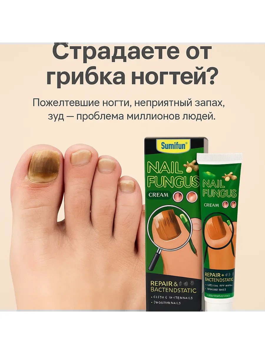 Подарите своим ногтям здоровый и ухоженный вид с нашим кремом для лечения грибка ногтей Sumifun! Используйте наш крем для ногтей чтобы избавиться от грибка ногтей на ногах, грибка ногтей на руках и для укрепления ногтевой пластины. Легкое и эффективное решение для лечения грибка ногтей дома. Закажите наш крем от грибка прямо сейчас и наслаждайтесь здоровыми и красивыми ногтями! Подходит для профилактики грибка ногтей, восстановления ногтей и ухода за ногтями.