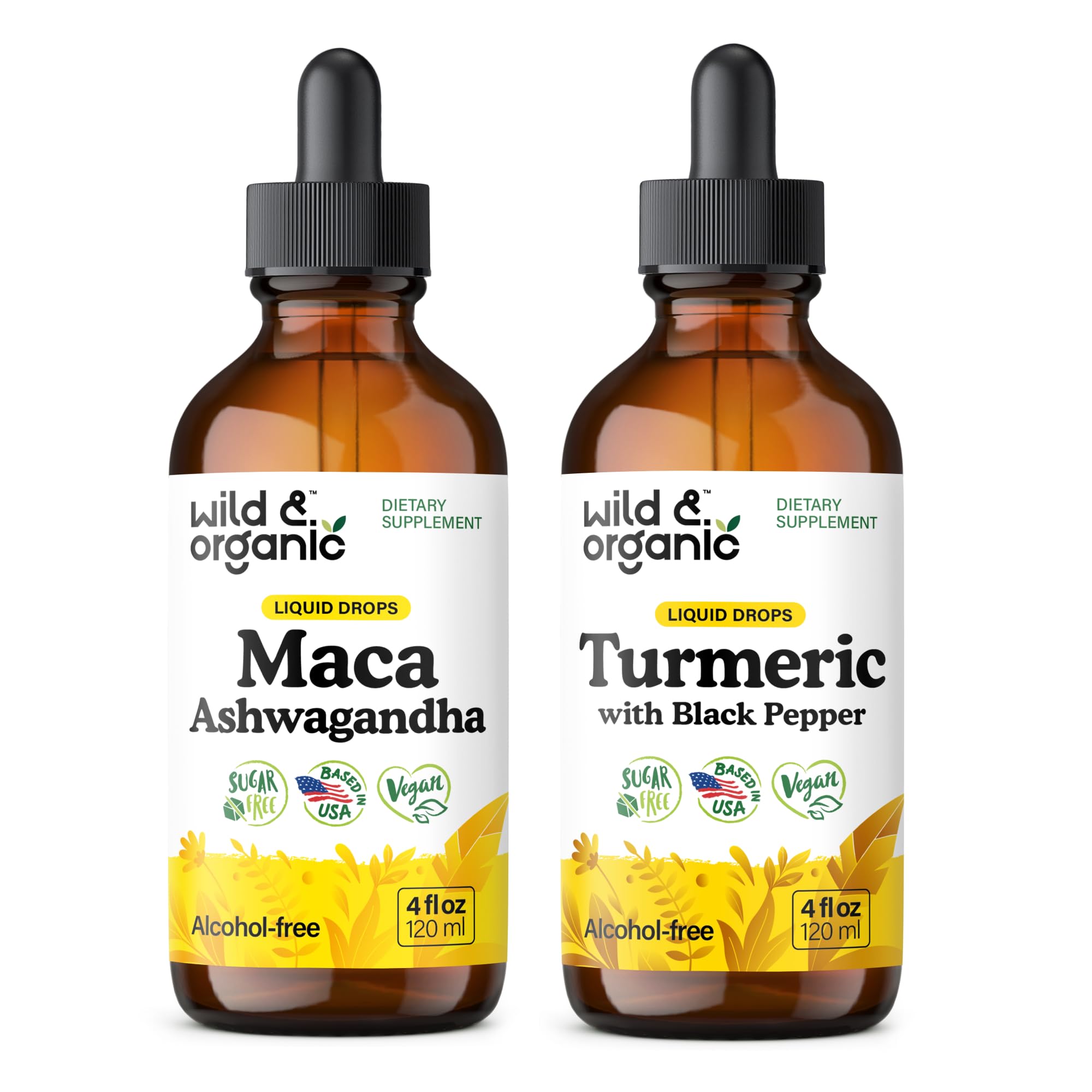 Sweetness Without Sugar: Enjoy a pleasant supplement experience with Wild Organic liquid extracts, which feature a naturally sweet taste. Our supplements use glycerin for natural sweetness, with no added sugar. Alcohol-Free: Wild Organic drops are vegetable glycerin-based, providing an alcohol-free tincture that is easy on digestion. Natural Formula: Our tinctures are made with only vegan ingredients, free from GMOs, and contain no artificial colors. Joint Support: Each serving of Wild Organic turmeric supplement with black pepper contains 720 mg of turmeric root extract and 10 mg of black pepper to support joint health. Overall Health Support: Each serving of Wild Organic maca ashwagandha tincture contains 400 mg of maca root and 280 mg of ashwagandha root extract to support good mood and overall well-being.