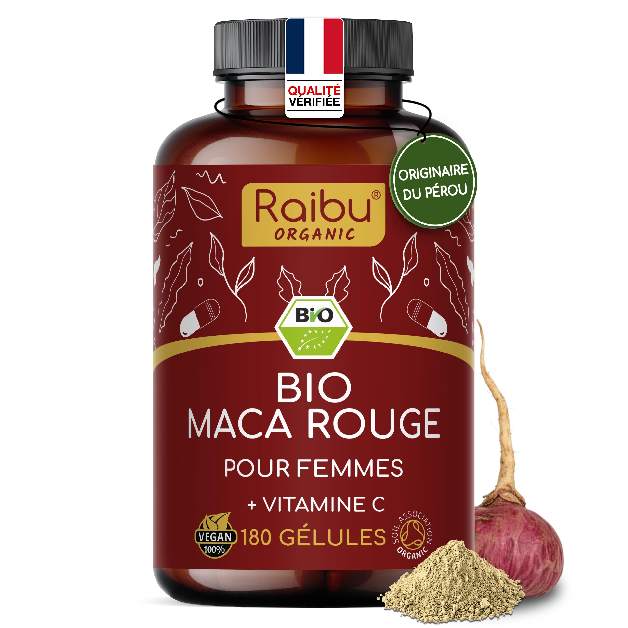 CERTIFIED ORGANIC LAB ANALYSED: Sourced from controlled organic farming, without additives or chemical residues. Each batch is tested by independent laboratories to guarantee purity, safety, and certified quality. ORGANIC PERUIAN MACA: Organic maca grown at over 3,500 meters altitude in the Peruvian Andes and directly selected on-site. Minimally processed to preserve all its natural purity. WHOLE ROOT RATHER THAN EXTRACT: We do not use red maca extract, but only whole root powder to preserve the full natural profile of the plant. A clear, authentic, and transparent choice. WITH VITAMIN C - ENERGY DEFENSE: Our red maca is enriched with natural vitamin C from acerola. Vitamin C contributes to normal energy-yielding metabolism, helps reduce fatigue, and supports the normal function of the immune system, while protecting cells against oxidative stress (EFSA, Regulation (EU) No 432 2012). ORGANIC RED MACA FOR WOMEN: Red maca from Peru (Lepidium meyenii), derived from whole root powder: 800 mg per capsule, i.e., 3,200 mg per day (equivalent to 12,800 mg of maca root). Traditionally valued for women's well-being, particularly during menstruation and menopause, it is associated with balance, vitality, and daily support.CERTIFIÉE BIO ANALYSÉE EN LABORATOIRE: Issue de l'agriculture biologique contrôlée, sans additifs ni résidus chimiques. Chaque lot est testé par des laboratoires indépendants afin de garantir pureté, sécurité et qualité certifiée. MACA DU PÉROU BIO: Maca bio cultivée à plus de 3.500 mètres d'altitude dans les Andes péruviennes et directement sélectionnée sur place. Faiblement transformée afin de conserver toute sa pureté naturelle. RACINE ENTIÈRE PLUTÔT QU'EXTRAIT : Nous n'utilisons pas d'extrait de maca rouge, mais uniquement de la poudre de racine entière afin de préserver l'intégralité du profil naturel de la plante. Un choix clair, authentique et transparent. VEC VITAMINE C - ÉNERGIE DÉFENSE: Notre maca rouge est enrichie en vitamine C naturelle issue de l'acérola. La vitamine C contribue à un métabolisme énergétique normal, aide à réduire la fatigue et soutient le fonctionnement normal du système immunitaire, tout en protégeant les cellules contre le stress oxydatif (EFSA, Règlement (UE) n 432 2012). MACA ROUGE BIO POUR LES FEMMES: Maca rouge du Pérou (Lepidium meyenii), issue de poudre de racine entière : 800 mg par gélule, soit 3 200 mg par jour (équivaut à 12 800 mg de racine de maca). Traditionnellement appréciée pour le bien-être féminin, notamment lors des périodes de menstruation et de ménopause, elle est associée à l'équilibre, à la vitalité et au soutien du quotidien.Maca du Pérou BIO - 180 gélules de Maca Rouge - Équilibre hormonal féminin - 3.200mg par jour (équivalent à 12.800mg de racine du Pérou) - Avec vitamine C naturelle - Sans gluten sans OGM