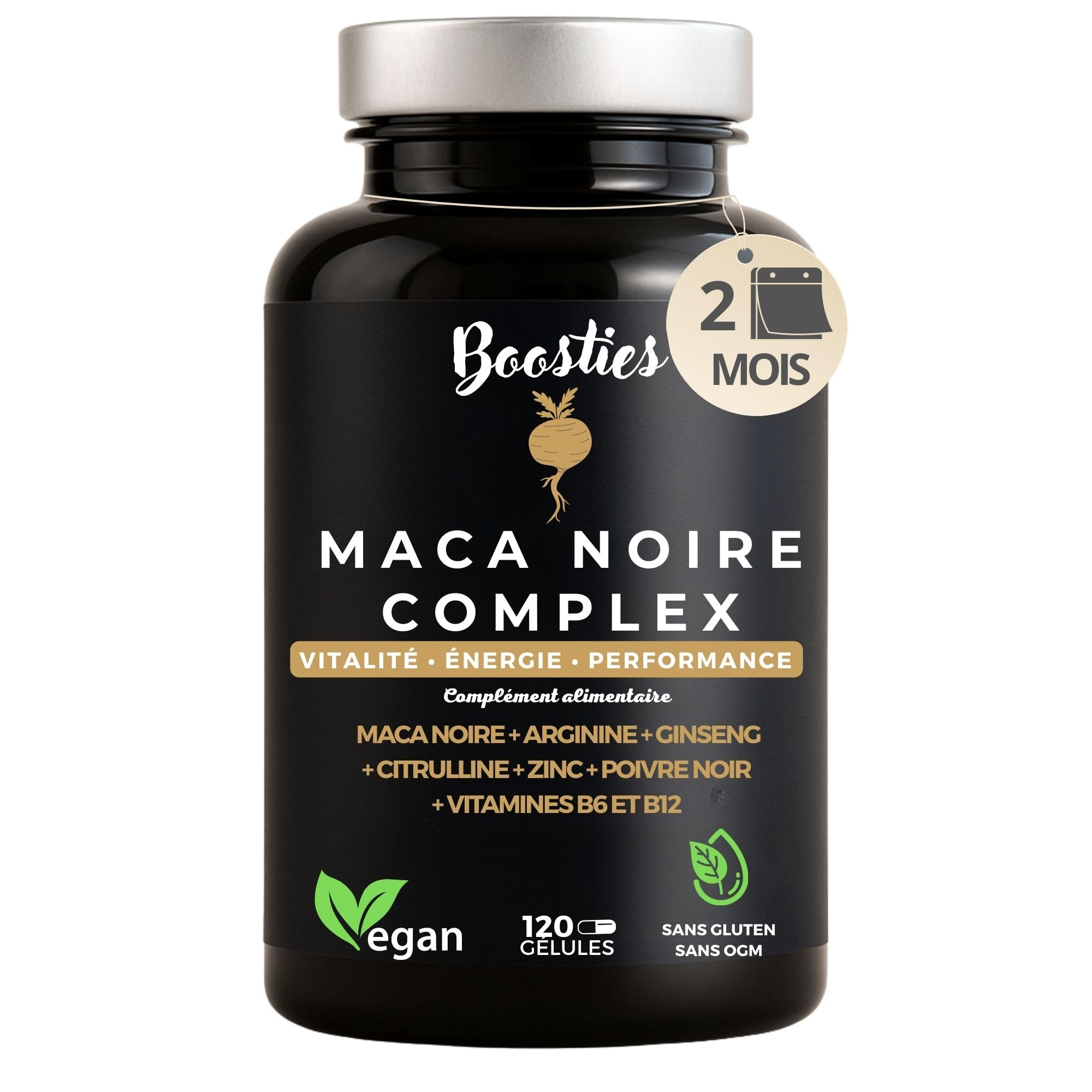 QUALITY GUARANTEED BY INDEPENDENT TESTING - Your trust is paramount. We guarantee the quality of each tablet through rigorous testing in certified independent laboratories. Our customer service team is available at any time for any questions or suggestions please don't hesitate to contact us. NATURE INSPIRES US - Guaranteed 100 Vegan, GMO-free, gluten-free, and free of artificial colors and flavors. Carefully manufactured in facilities that meet the strictest quality standards, our product is an expression of trust and dedication to your well-being. BOOST YOUR ENERGY, PERFORMANCE, AND STRENGTH: Black Maca Complex is suitable for both men and women seeking comprehensive natural support. Thanks to its tailored formula, it supports you from morning to night, during periods of stress, fatigue, or intense physical activity. Perfect for athletes, active people, or anyone looking to feel better, naturally, even at the end of the night. COMPLETE FORMULA - 7 SYNERGISTIC ACTIVE INGREDIENTS FOR VISIBLE RESULTS: More than just a maca-based supplement, Boosties combines it with carefully measured complementary ingredients: L-Citrulline L-Arginine to promote circulation and physical performance Ginseng, known for its tonic effect on the body Zinc, vitamins B6 and B12 to support energy metabolism, immunity, and combat fatigue and Piperine (95 ) to improve absorption and the overall effectiveness of the complex. ULTRA-CONCENTRATED BLACK MACA EXTRACT (20:1) – 16,000 MG EQUIVALENT PER DOSE. Black maca is the most potent variety, prized for its revitalizing effects. Each 2-capsule dose contains 800 mg of 20:1 extract, equivalent to 16,000 mg of raw root, for maximum impact on your physical and mental vitality. A premium choice that very few brands offer!QUALITÉ GARANTIE PAR DES TESTS INDÉPENDANTS - Votre confiance est primordiale. Nous garantissons la qualité de chaque comprimé grâce à des tests rigoureux dans des laboratoires indépendants certifiés. Notre service client est à votre écoute à tout moment pour toutes questions ou suggestions, n'hésitez pas à nous contacter. LA NATURE NOUS INSPIRE - Garanti 100 Végan, sans OGM, ni gluten, ni colorants artificiels ou les arômes artificiels. Fabriqué avec soin dans des installations conformes aux normes de qualité les plus strictes, notre produit est une expression de confiance et de dévouement envers votre bien-être. BOOSTER VOTRE ÉNERGIE, PERFORMANCE ET FORCE : Maca Noire Complex s'adresse aussi bien aux hommes qu'aux femmes en quête d'un soutien naturel complet, sans distinction. Grâce à sa formule adaptée, il vous accompagne du matin au soir, en période de stress, de fatigue ou d'activité physique intense. Parfait pour les sportifs, les actifs, ou les personnes cherchant à se sentir mieux, naturellement, même au bout de la nuit. FORMULE COMPLÈTE - 7 ACTIFS SYNERGIQUES POUR DES RÉSULTATS VISIBLES: Bien plus qu'un simple complément à base de maca, Boosties y associe des ingrédients complémentaires soigneusement dosés,L-Citrulline L-Arginine pour favoriser la circulation et les performances physiques, Ginseng reconnu pour son effet tonique sur l'organisme. Zinc, vitamines B6 et B12 pour soutenir le métabolisme énergétique, l'immunité et lutter contre la fatigue. Pipérine (95 ) pour améliorer l'absorption et l'efficacité globale du complexe. EXTRAIT DE MACA NOIRE ULTRA-CONCENTRÉ (20:1) – 16 000 MG ÉQUIVALENT PAR DOSE La maca noire est la variété la plus puissante, prisée pour ses effets revitalisants. Chaque dose de 2 gélules contient 800 mg d'extrait 20:1, soit l'équivalent de 16 000 mg de racine brute, pour un impact maximal sur votre vitalité physique et mentale. Un choix premium que très peu de marques proposent !.Maca Noire avec Ginseng 36 000mg - 120 gélules vegan (4 mois) - Complexe enrichi en Panax Ginseng, L-Arginine,Citrulline, Zinc, Vitamines B6 et B12, Poivre Noir - Extrait de racine de Maca (21:1) Maca noire complex