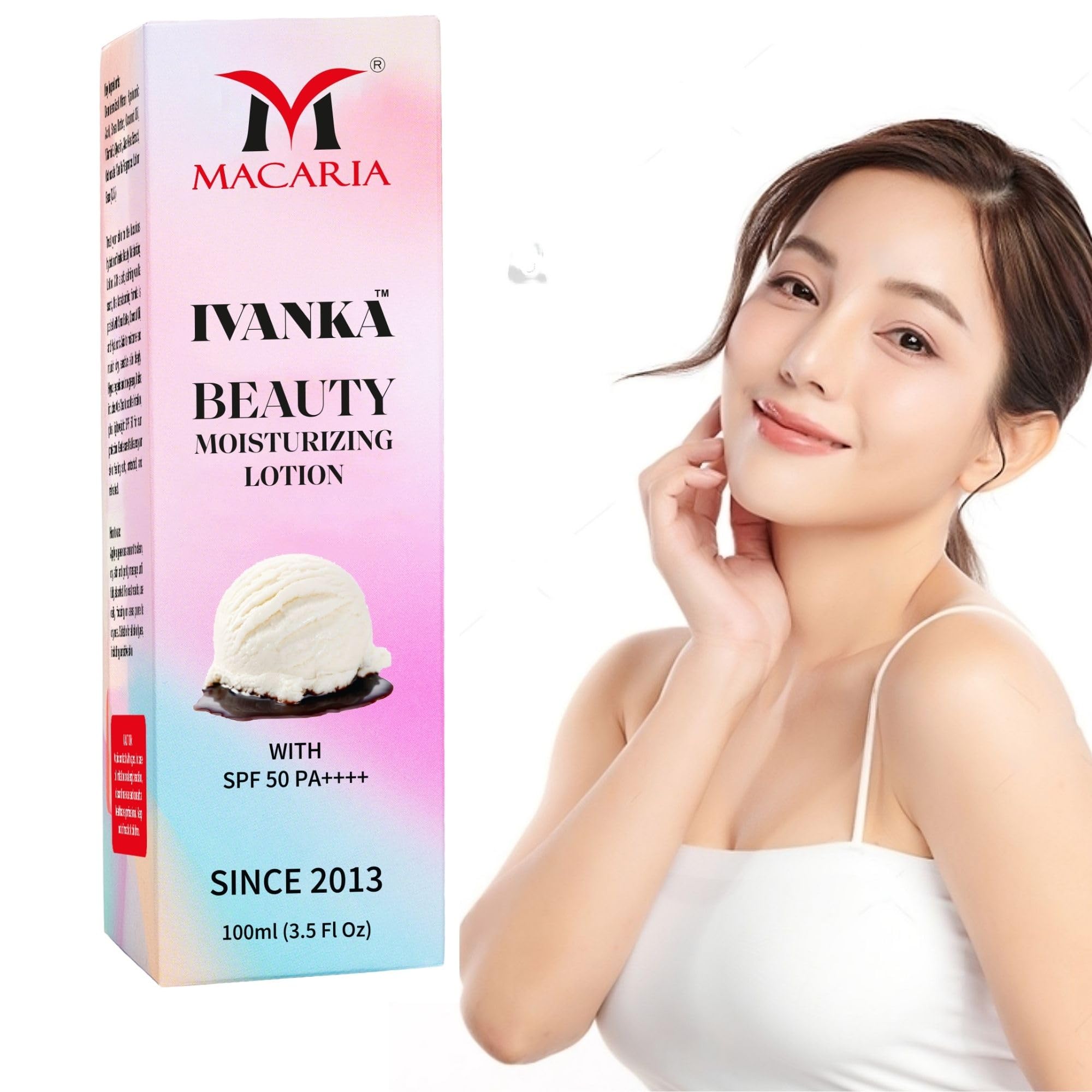 Introducing Macaria Ivanka Beauty Moisturizing Lotion, your ultimate skincare solution for soft, hydrated, and protected skin. This luxurious lotion features a soothing vanilla fragrance and a smooth, lightweight texture that absorbs quickly without leaving any greess behind. It's designed to hydrate, moisturize, and lock in moisture, making it perfect for all skin types, including sensitive skin. With SPF 50 PA , this moisturizing lotion not only nourishes your skin but also offers advanced sun protection, shielding you from harmful UV rays. The combination of high-quality ingredients like Hyaluronic Acid, Shea Butter, Coconut Oil, Vitamin E, and Aloe Vera Extract provides deep hydration, leaving your skin feeling soft and smooth all day long. Macaria Ivanka Beauty Moisturizing Lotion is formulated with Advanced Bangkok Technology, making it a truly unique and effective choice for your daily skincare routine. Say goodbye to dryness and discomfort, and give your skin the nourishment it deserves with this fast-absorbing, non-greasy lotion. Don't miss out on the ultimate skin care experience, add Macaria Ivanka Beauty Moisturizing Lotion to your routine today for silky, hydrated, and protected skin!Three-in-One Skin Care: Helps with the problem of dry skin and sun damage with its unique blend of nourishing ingredients and sun protection a solution for radiant, healthy skin. Soothes the Skin: Combines the soothing properties of Aloe Vera Extract and Vitamin E with a delightful vanilla fragrance calms irritation and enhances the skin's natural glow. Broad Spectrum Sun Protection: Protects against harmful UV rays with SPF 50 PA , ensuring all-day skin safety while maintaining a non-greasy, quick-absorbing formula. Deep Moisturization: Deeply moisturizes and locks in hydration with the power of Hyaluronic Acid, Shea Butter, and Glycerin leaves skin soft and supple without feeling greasy. Advanced Bangkok Technology: Formulated with Advanced Bangkok Technology, Ivanka Beauty Moisturizing Lotion delivers unparalleled hydration while maintaining a lightweight, smooth texture perfect for daily use on sensitive skin.Ivanka Beauty Full body skin whitening Lotion for men women Introducing Macaria Ivanka Beauty Moisturizing Lotion, your ultimate skincare solution for soft, hydrated, and protected skin. This luxurious lotion features a soothing vanilla fragrance and a smooth, lightweight texture that absorbs quickly without leaving any greess behind. It's designed to hydrate, moisturize, and lock in moisture, making it perfect for all skin types, including sensitive skin. With SPF 50 PA , this moisturizing lotion not only nourishes your skin but also offers advanced sun protection, shielding you from harmful UV rays. The combination of high-quality ingredients like Hyaluronic Acid, Shea Butter, Coconut Oil, Vitamin E, and Aloe Vera Extract provides deep hydration, leaving your skin feeling soft and smooth all day long. Macaria Ivanka Beauty Moisturizing Lotion is formulated with Advanced Bangkok Technology, making it a truly unique and effective choice for your daily skincare routine. Say goodbye to dryness and discomfort, and give your skin the nourishment it deserves with this fast-absorbing, non-greasy lotion. Don't miss out on the ultimate skin care experience, add Macaria Ivanka Beauty Moisturizing Lotion to your routine today for silky, hydrated, and protected skin!Three-in-One Skin Care: Helps with the problem of dry skin and sun damage with its unique blend of nourishing ingredients and sun protection a solution for radiant, healthy skin. Soothes the Skin: Combines the soothing properties of Aloe Vera Extract and Vitamin E with a delightful vanilla fragrance calms irritation and enhances the skin's natural glow. Broad Spectrum Sun Protection: Protects against harmful UV rays with SPF 50 PA , ensuring all-day skin safety while maintaining a non-greasy, quick-absorbing formula. Deep Moisturization: Deeply moisturizes and locks in hydration with the power of Hyaluronic Acid, Shea Butter, and Glycerin leaves skin soft and supple without feeling greasy. Advanced Bangkok Technology: Formulated with Advanced Bangkok Technology, Ivanka Beauty Moisturizing Lotion delivers unparalleled hydration while maintaining a lightweight, smooth texture perfect for daily use on sensitive skin.