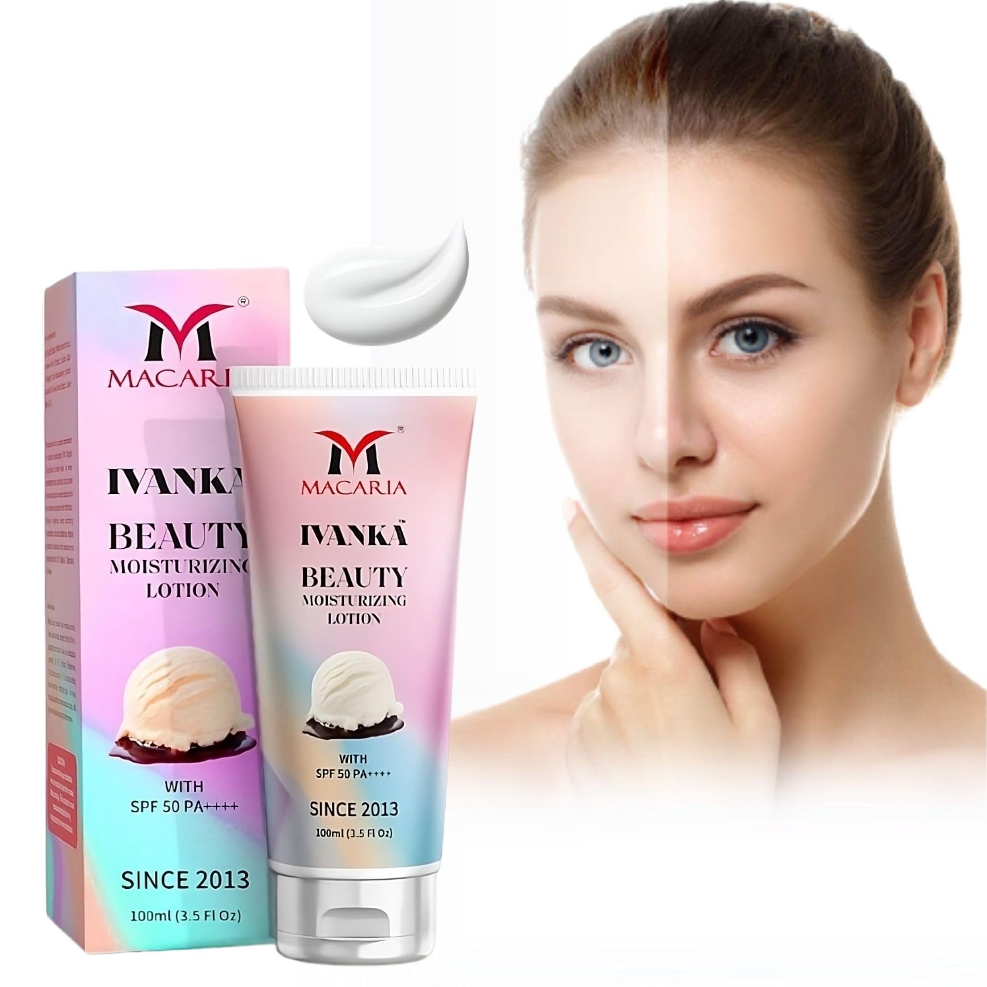 Ivanka Beauty Body Lotion SPF 50 with Hyaluronic Acid Vanilla – Daily Moisturizer for Glowing, Protected Skin Treat your skin to all-day hydration and sun protection with Ivanka Beauty Body Lotion SPF 50, a premium blend of hyaluronic acid, shea butter, vitamin E, and aloe vera. This fast-absorbing, non-greasy body lotion deeply moisturizes dry or rough skin while shielding it from harmful UVA UVB rays.Infused with a soothing vanilla body lotion fragrance, it gives your skin a light scent while delivering benefits. Whether you're indoors or on the go, this moisturizing sunscreen body lotion is ideal for year-round use.