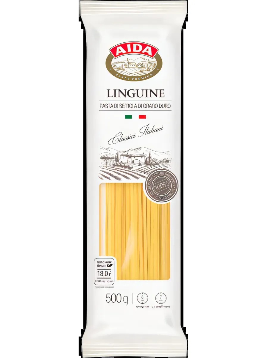 AIDA Pasta Noodles Group A Premium Grade, 500g. AIDA Pasta Noodles Group A Premium Grade – this special type of narrow flat pasta is described by three parameters: length 250mm, width 3.5mm, thickness 0.8mm. The product is made from selected durum wheat flour with optimal gluten content.