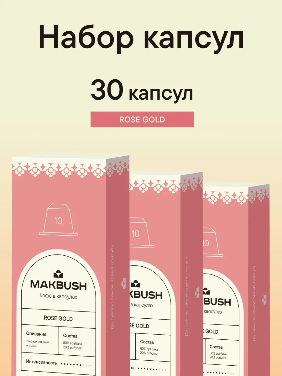 Набор кофе в капсулах MakBush ROSE GOLD (30 капсул) – это выразительный и яркий кофе для тех, кто любит шоколадно-ореховый вкус и длительное послевкусие темных сухофруктов. Уникальная смесь арабики и робусты раскроет вкус в каждой чашке.