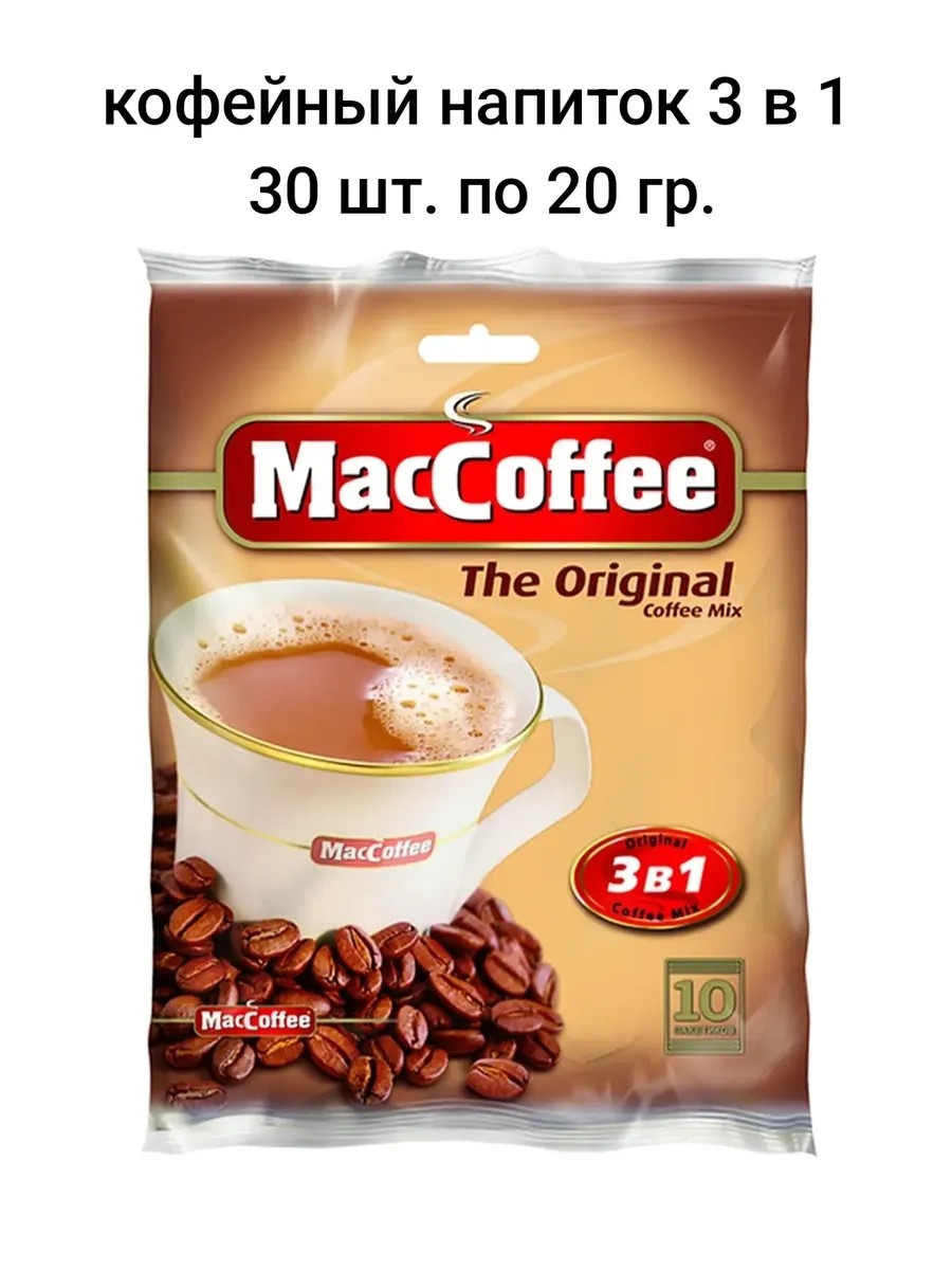 Кофе 3 в 1 в пакетиках растворимый MacCoffee The original — это вкусный кофейный напиток в удобной упаковке нового формата в набор которой входят 30 шт кофе в стиках по 20 грамм! Это сочетание даёт яркий и неповторимый вкус и насыщенный аромат МакКофе Три в Одном. Идеальная чашка кофе, которая дарит наслаждение всегда и везде. Это растворимый кофейный напиток, который не только наполняет энергией, но и дарит богатство ощущений благодаря насыщенному вкусу, а также удобству употребления в любое время при любых обстоятельствах. Каждый пакетик состоит из смешанных компонентов: бразильский кофе, голландские сливки и малайзийский сахар. Теперь кофе растворимый в пакетиках можно заварить где угодно: на работе, пока все стоят в очереди к автомату, в путешествии у костра, на перерыве между занятиями. Вам понадобится только горячя вода и кружка, а насыщенный кофейный вкус с нежной пенкой сделает вашу паузу еще приятнее. Фольгированная упаковка предотвращает попадание в смесь влаги и неприятных запахов, поэтому вы можете смело класть пакетики кофе MacCoffee The original 3в1 в карман сумки, независимо от ее размера и дальности поездки. Отрывной верх позволяет приготовить любимый растворимый кофе в пакетиках еще быстрее, всего за несколько секунд. Кофе порционный MacCoffee — это выбор спортсменов и путешественников, активных и мобильных людей, которые не теряют время зря.