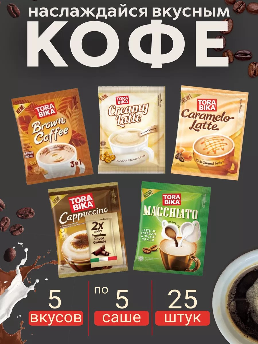 Кофе в пакетиках - идеальное решение для всей семьи! В нем представлены пять разных вкусов в количестве 25 штучек растворимого кофе 3 в 1, которые обязательно понравятся каждому Cappuccino, Creamy Latte, Macchiato Espresso, Brown, Caramelo Latte.