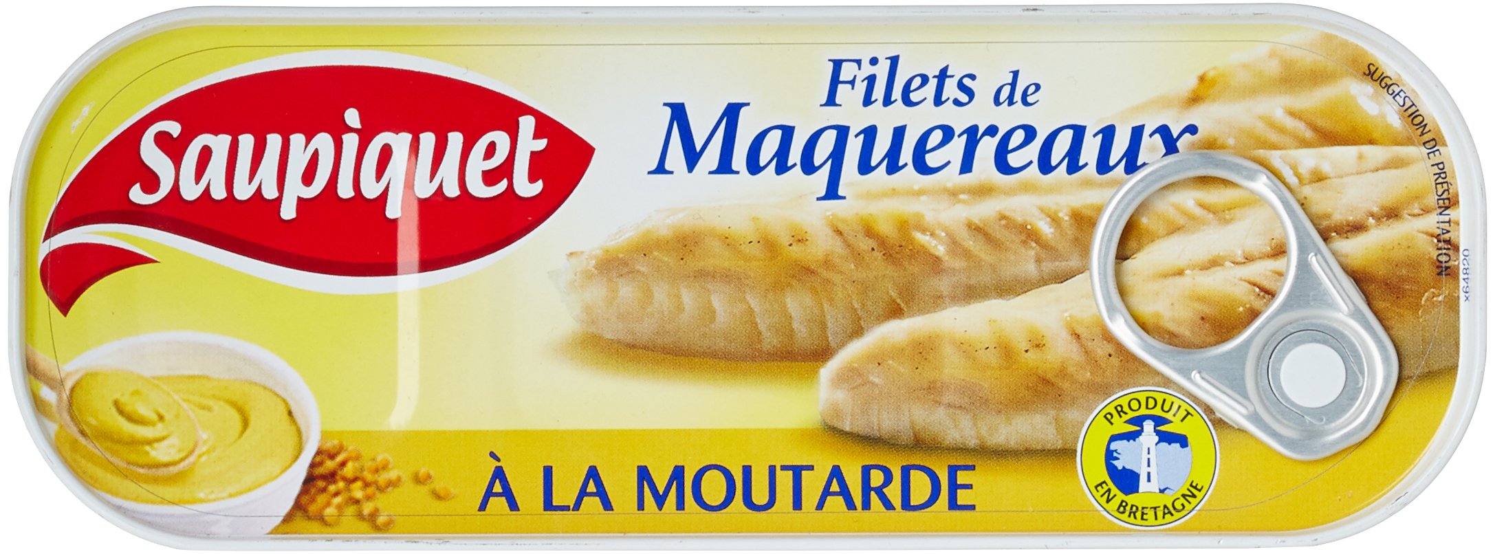 Saupiquet of Mackerel with Mustard Can 169g INGREDIENTS MACKEREL fillets (56 ), water, Dijon MUSTARD (8 ) (water, MUSTARD seeds, vinegar, salt), vinegar, sunflower oil, salt, processed corn starch, thickeners: guar gum and xanthan gum, black pepper, natural flavorings, color: paprika extract. Scomber scombrus Allergens: FISH, MUSTARD INSTRUCTIONS FOR USE After opening, please store the product in suitable food packaging, in the refrigerator (0 to 4(C)) and consume it within 48 hours DISCLAIMER Non-contractual photograph. The above information is given for information purposes only. It is not necessarily exhaustive and cannot replace the information on the product packaging, which alone is authentic, and to which you are invited to refer, particularly in the event of food intolerance. Country of origin: France. Saupiquet de Maquereaux À la Moutarde la Boîte 169g INGRÉDIENTS Filets de MAQUEREAUX (56 ), eau, MOUTARDE de Dijon (8 ) (eau, graines de MOUTARDE, vinaigre, sel), vinaigre, huile de tournesol, sel, amidon transformé de maïs, épaississants : gomme guar et gomme xanthane, poivre noir, arômes naturels, colorant : extrait de paprika. Scomber scombrus Allergènes : POISSONS, MOUTARDE MODE D'EMPLOI Après ouverture, veuillez conserver le produit dans un conditionnement alimentaire approprié, au réfrigérateur (0 à 4(C) et le consommer dans les 48h CLAUSE DE NON-GARANTIE Photographie non contractuelle. Les indications ci-dessus sont données à titre d'information. Elles ne sont pas forcément exhaustives et ne sauraient se substituer aux informations figurant sur l'emballage du produit qui font seules foi, et auxquelles vous êtes invités à vous reporter, notamment en cas d'intolérance alimentaire. Pays d'origine : France.