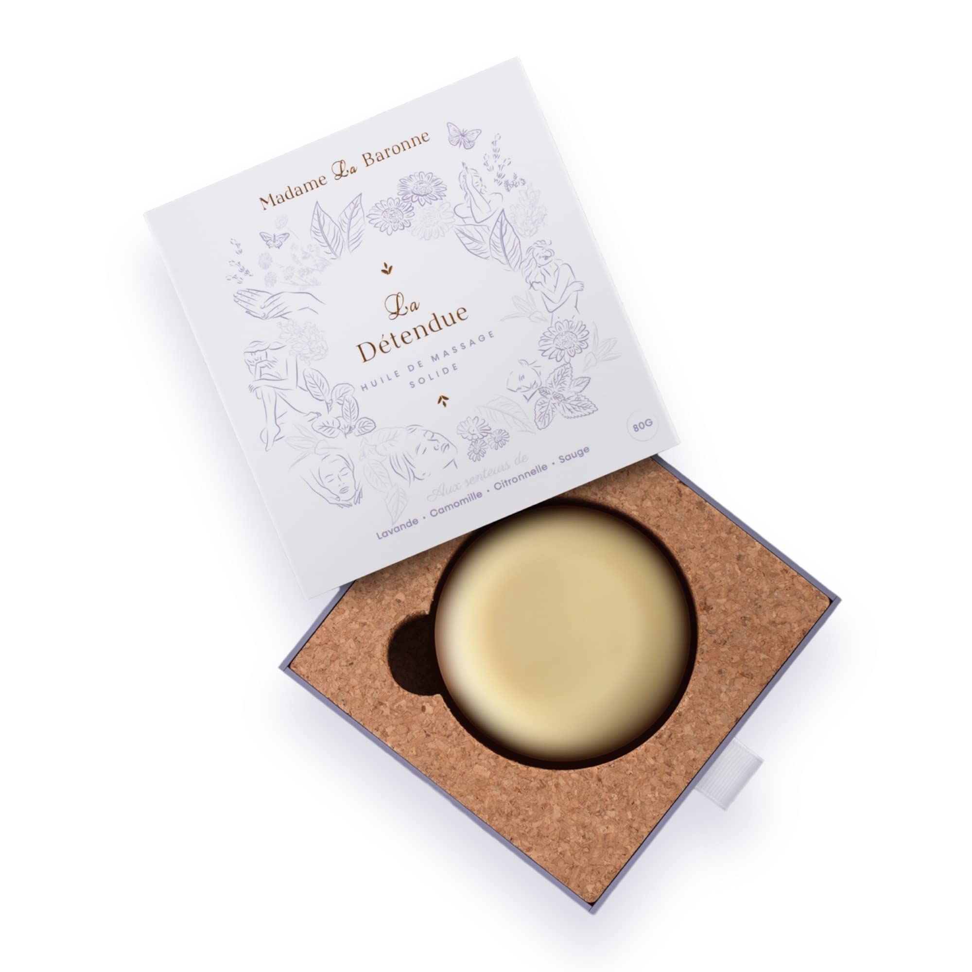 : A little natural boost to help you relax and let go. Before bed, or whenever you need a dose of calm, massage the inside of your wrists or your solar plexus, breathe slowly, and relax… Sleep is vital for both mind and body. A true remedy for modern life and the consequences of a hectic lifestyle, La Détendu will help you fall asleep more easily. This solid massage oil is a soothing blend perfect for calming your anxieties and finding rest. Wake up relaxed and refreshed, ready to face the day. Ingredients: COCOS NUCIFERA OIL (ORGANIC COCONUT OIL), THEOBROMA CACAO SEED BUTTER (ORGANIC COCOA BUTTER), BUTYROSPERMUM PARKII BUTTER (ORGANIC SHEA BUTTER), ORYZA SATIVA BRAN WAX (RICE WAX), PARFUM (ESSENTIAL OILS INCLUDING LAVANDI, PETITGRAIN, CHAMOMILE), TOCOPHEROL (NATURALLY SOURCED VITAMIN E), LINALOOL , CITRAL , GERANIOL , D-LIMONENE , CITRONELLOL , EVERNIA PRUNASTRI EXTRACT Naturally occurring in essential oils From organic farmingKeep your skin soft and healthy while calming your mind and body for restful sleep. Let go and relax.Description du produit Un petit coup de pouce naturel pour vous aider à vous détendre et à lâcher prise. Avant de vous coucher, ou chaque fois que vous aurez besoin d'une dose de calme, massez les faces internes de vos poignets ou votre plexus solaire, respirez lentement et détendez-vous… Le sommeil est vital pour l'esprit et le corps. Véritable remède à la vie moderne et aux conséquences d'un mode de vie trépidant, La Détendue facilitera votre endormissement. Cette huile de massage solide est un mélange apaisant parfait pour calmer vos angoisses et trouver le repos. Réveillez vous détendue et rafraichis, prête à affronter la journée. Ingrédients NGREDIENTS : COCOS NUCIFERA OIL (HUILE DE COCO BIO), THEOBROMA CACAO SEED BUTTER (BEURRE DE CACAO BIO), BUTYROSPERMUM PARKII BUTTER (BEURRE DE KARITE BIO), ORYZA SATIVA BRAN WAX (CIRE DE RIZ), PARFUM (HUILES ESSENTIELLES DONT LAVANDIN, PETIT GRAIN, CAMOMILLE), TOCOPHEROL (VITAMINE E D'ORIGINE NATURELLE), LINALOOL , CITRAL , GERANIOL , D-LIMONENE , CITRONELLOL , EVERNIA PRUNASTRI EXTRACT Naturellement présent dans les huiles essentielles Issu de l'agriculture biologiqueGarde votre peau douce et saine tout en calmant votre esprit et votre corps pour un sommeil réparateur. Lâchez prise et détendez-vous.Madame La Baronne?Huile de massage solide?Lavande et Camomille?Détente et relaxation?100 naturel?Aromathérapie