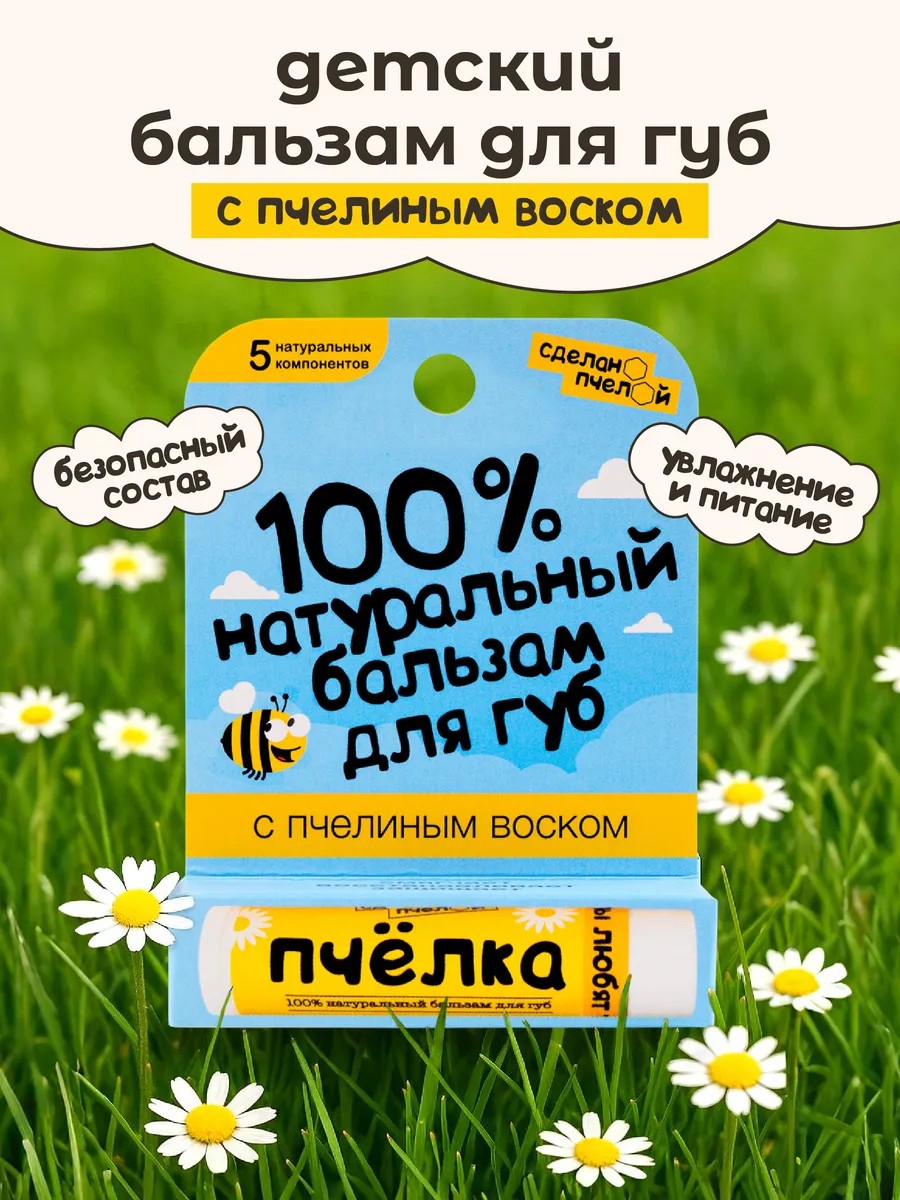 Позаботьтесь о нежной коже маленьких губ с детским бальзамом с натуральным составом Сделанопчелой — идеальный выбор для повседневного использования. Гигиеническая помада для детей "Пчёлка"создана на основе натуральных масел и пчелиного воска, обеспечивая надежную защиту и деликатный уход. Формула обогащена увлажняющими компонентами: масло для губ и воск для губ создают на поверхности тончайшую пленку, которая предотвращает сухость, защищает от обветривания и заживляет трещинки. Мини бальзам для губ прозрачный и бесцветный — подходит даже самым маленьким. Это не просто гигиеничка, а настоящее средство ухода, объединившее функции помады-бальзама, масла-бальзама и питательной увлажняющей помады для детей. Тающая текстура нежно ложится, мгновенно смягчая и придавая ощущение комфорта. Лечебный бальзам стик восстанавливает и препятствует потере влаги, не липкий, не скатывается. Аромат ромашки делает использование особенно приятным, а компактный размер позволяет взять мини-бальзам для губ с собой в школу, на прогулку или в путешествие. Эта натуральная косметика подойдет как для девочек, так и для мальчиков. Прозрачная помада без цвета легко наносится, не пачкает одежду, не вызывает раздражений. Милая гигиеничка подходит для подростков, школьников и малышей. Губнушку можно использовать как ночной бальзам, средство от шелушений, от трещин и сухости или питательную помаду. Красивая косметика для губ не только украшает, но и заботится. Такой подарочный бальзам для губ в стике станет отличным элементом набора детской косметики или дополнением к косметичке юной леди, который можно купить не дорого и в качестве подарка на день рождения. Все просто - сделано пчелой!