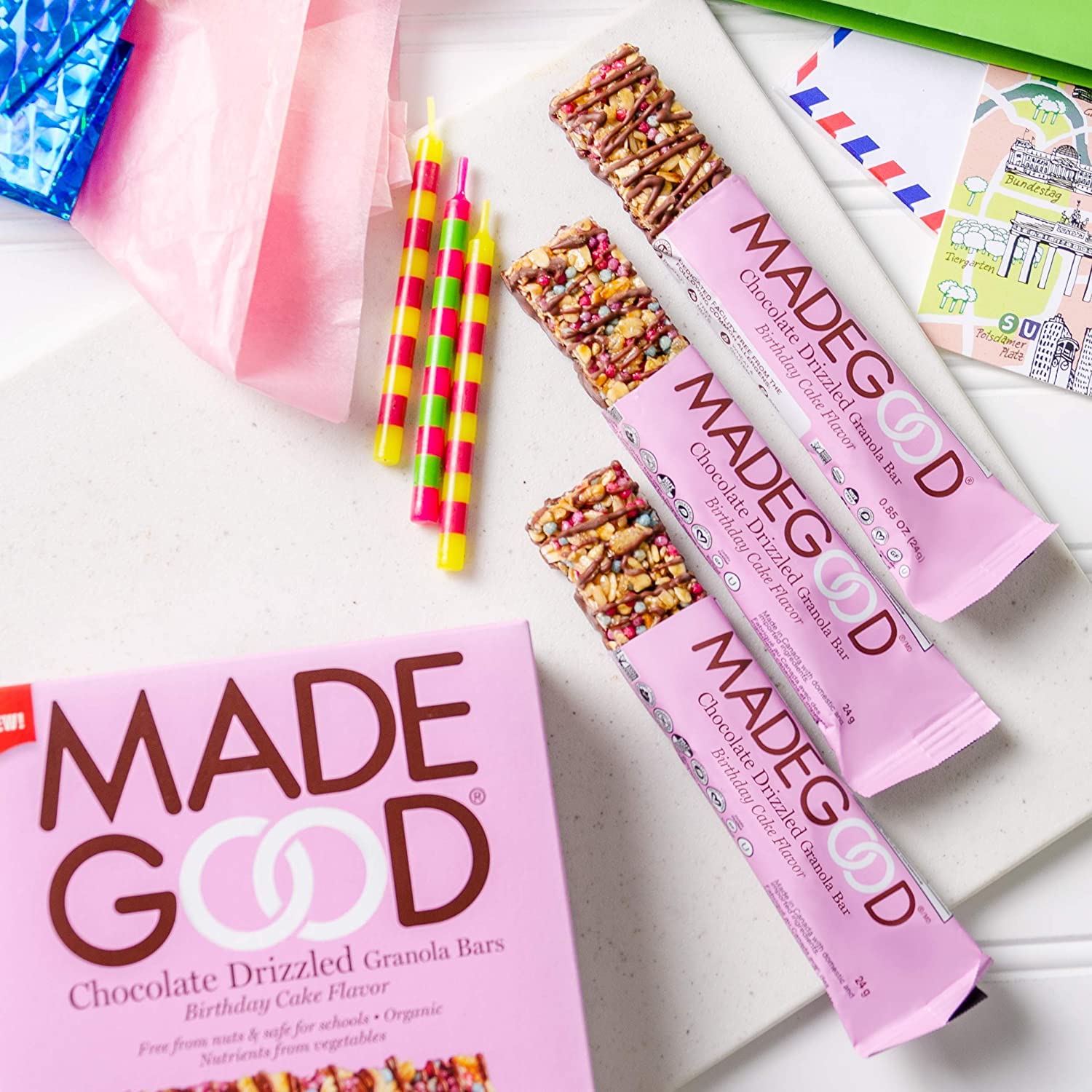 Contents: 120g (5x24g) properties: ingredients oatmeal gluten-free, chocolate (pipe sugar , cocoa basse , cocoa butter ), dried agave syrup , rice sprinkle (puffed sweetened rice , glucose fructose syrup (pipe sugar) , Salt], separation: vegetable glycerin , Oatmeal gluten-free, natural aroma, vegetable extract 0.4 (spinach, broccoli, carrots, tomatoes, beets), Shiitake mushroom extract, salt, gelling agent: agar agar Storage Biodegrading Storage.Responsible food company Riverside International B.V., D. Egginkstraat 10, 2131 BK WK HOOFDDORP Öko-controlled Ca -org-16 (non-EU agriculture) nutritional values per 100g condensing value 1832 kJ 436 kcal fat 15 g-of which saturated fatty acids 5.3 gCarbohydrates 65 g - of which sugar 26 g protein 6.5 g salt 0.16 g Ingredients ingredients Reiner gluten -free oat , sugar (agavensirup , brown rice syrup , pipe sugar ), chocolate (cane sugar , unsweetened chocolate , cocoa butter ), stray (rice kronis [rice flour , pipe syrup , salt], herbal glycerin , Sunflower oil , beet red powder , purple sweet potato extract [maltodex extract trin, violet sweet pot ato extract, citric acid] Spirulina extract ), brown rice chips , sunflower oil , natural taste , vegetable extracts (spinach, broccoli, carrots, Tomatoes, beets, shiitake mushrooms), salt, agar . Biocooked in our committed allergen -free facility.With only 7 grams of sugar, these sweet delicacies are a child's snack that you can feel like.Free of 8 allergens, these gluten -free snacks are nut -free, organic, vegan, genetic engineering -free and kosher.Not only delicious, gluten -free Madegood bars are packed with vegetable nutrients in every portion.Excellent source of Vitamin A, C, D, E, B6 and B1.Hypoallergenic and nut -free, these granola bars are perfect for school, afternoon collection or as a treat.Madegood chocolate bars are perfect treats for children and adults.Free of the most common allergens, these granola Kauriegel are a safe snack for school.Inhalt: 120g (5x24g) Eigenschaften: Zutaten HAFERflocken glutenfrei, Schokolade (Rohrzucker , Kakaomasse , Kakaobutter ), getrockneter Agavensirup , Reisstreusel (gepuffter gesüßter Reis [Reismehl , Glukose-Fructose-Sirup (Rohrzucker) , Salz], Trennmittel: pflanzliches Glycerin Sonnenblumenöl , Rübenpulver , lila Süßkartoffelpulver [Maltodextrin, violetter Süßkartoffelextrakt, Säuerungsmittel: Zitronensäure], Spirulinaextrakt ), Glukosesirup (brauner Reis), Invertzuckersirup , Sonnenblumenöl , gepuffter Naturreis , HAFERmehl glutenfrei, natürliches Aroma, Gemüseextrakt 0,4 (Spinat, Brokkoli, Karotten, Tomaten, Rüben), Shiitake-Pilzextrakt, Salz, Geliermittel: Agar-Agar aus kontrolliert biologischem Anbau Aufbewahrungshinweise Trocken lagern und vor Wärme schützen verantwortliches Lebensmittelunternehmen Riverside International B.V., D. Egginkstraat 10, 2131 BK WK Hoofddorp ÖKO-Kontrollstelle CA-ORG-16 (Nicht-EU-Landwirtschaft) Nährwerte je 100g Brennwert 1832 kJ 436 kcal Fett 15 g - davon gesättigte Fettsäuren 5,3 g Kohlenhydrate 65 g - davon Zucker 26 g Eiweiß 6,5 g Salz 0,16 g INHALTSSTOFFE ZUTATEN Reiner glutenfreier Hafer , Zucker (Agavensirup , brauner Reissirup , Rohrzucker ), Schokolade (Rohrzucker , ungesüßte Schokolade , Kakaobutter ), Streus (Reiskronis [Reismehl , Rohrsirup , Salz], pflanzliches Glycerin , Sonnenblumenöl , Rübenrotes Pulver , lila Süßkartoffelextrakt [Maltodexextrakt Trin, violetter Süßtopf Ato-Extrakt, Zitronensäure] Spirulina-Extrakt ), braune Reis-Chips , Sonnenblumenöl , natürlicher Geschmack , pflanzliche Extrakte (Spinat, Brokkoli, Karotten, Tomaten, Rüben, Shiitake-Pilze), Salz, Agar . BioGekocht in unserer engagierten allergenfreien Einrichtung. Mit nur 7 Gramm Zucker sind diese süßen Leckereien ein Kindersnack, über den Sie sich wohl fühlen können. Frei von 8 Allergenen, diese glutenfreien Snacks sind nussfrei, organisch, vegan, gentechnikfrei und koscher. Nicht nur leckere, glutenfreie MadeGood Riegel sind vollgepackt mit pflanzlichen Nährstoffen in jeder Portion. Ausgezeichnete Quelle von Vitamin A, C, D, E, B6 und B1. Hypoallergen und nussfrei, diese Granola Riegel sind perfekt für die Schule, einen Nachmittagsabholung oder als Leckerbissen. MadeGood Schokoriegel sind perfekte Leckereien für Kinder und Erwachsene. Frei von den häufigsten Allergenen, sind diese Granola Kauriegel ein sicherer Snack für die Schule.MadeGood Bio-Geburtstagskuchen, Schokolade, getropft, vegane Riegel