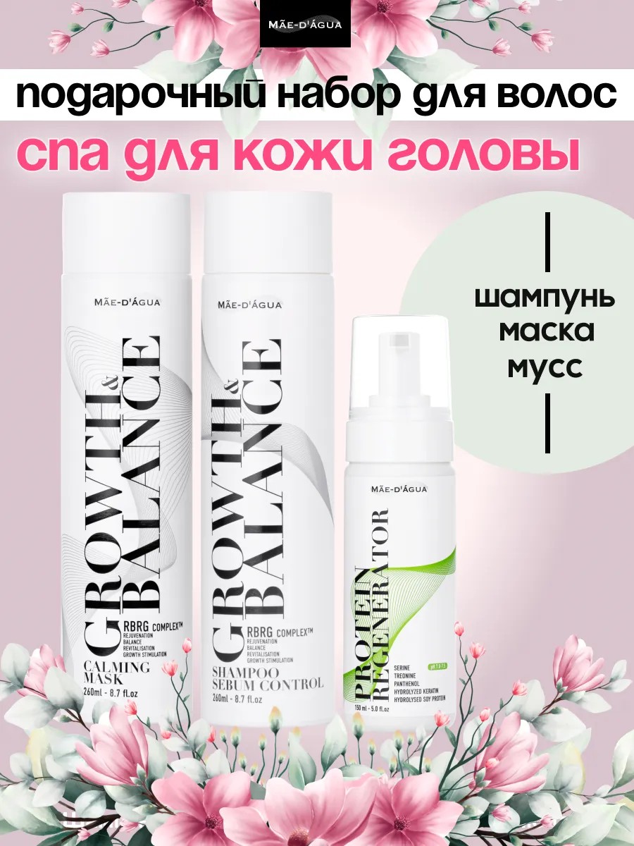 В основе подарочного набора линейка GROWTH & BALANCE и наш уникальный мусс регенератор, которые помогают восстановить здоровье кожи головы и усилить рост волос.