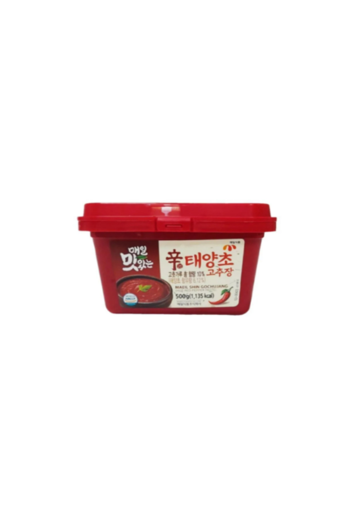 MAEIL SHIN GOCHUJANG RED PEPPER PASTE 500GR INGREDIENTS: Wheat flour 1.49, Corn syrup (, Mixed spices (red pepper powder, water, salt, garlic, onion) .30, water .45, Sea Salt 5.88 , Red pepper powder 5.88 , By volume Ethyl Alcohol 3 , Hydrolyzed Vegetable Protein (Wheat) 1 . Store in a cool and dry place. Best Before Date: 18.08.2025