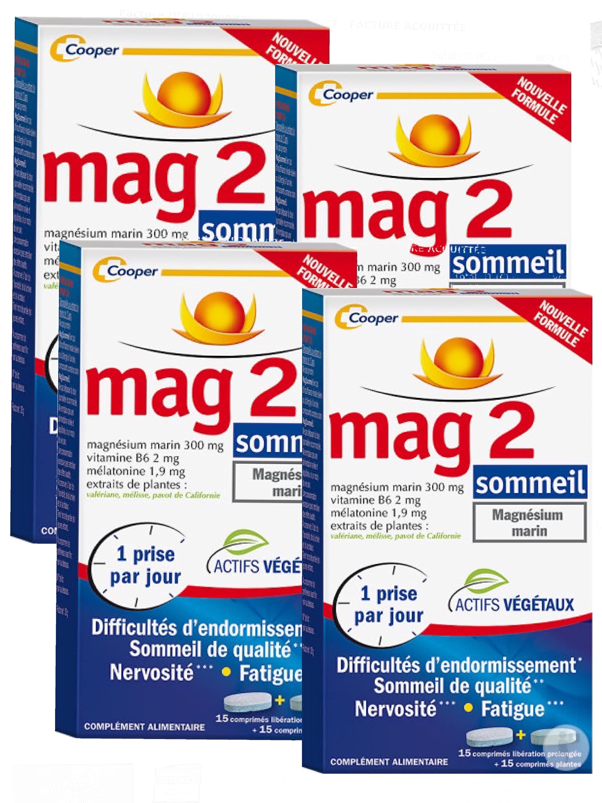 Magnesium is essential for the proper functioning of the body and an insufficient intake can cause nervousness and fatigue, which can cause difficulty falling asleep. Mag2sommeil, a complete formula: Daily intake of magnesium and vitamin B6 helps reduce fatigue and nervousness. Melatonin at 1.9 mg helps reduce the time it takes to fall asleep. The beneficial effect is obtained when taking 1 mg before bedtime. Valerian helps maintain natural sleep and normal sleep quality California poppy helps improve natural sleep quality and promotes relaxation Lemon balm helps maintain healthy sleep. Mag2sommeil's complete sleep formula has no known dependence at recommended doses. INGREDIENTS Tablet 1: Marine magnesium (magnesium oxide), anti-caking agents (microcrystalline cellulose, dicalcium phosphates, mono and diglycerides of fatty acids, magnesium salts of fatty acids, silicon dioxide [nano]. Bulking agents: hydroxypropylmethylcellulose, tricalcium phosphates, cocoa extract (Theobroma cacao, bean), vitamin B6 (pyridoxine hydrochloride), thickener: carboxymethylcellulose sodium, melatonin, coloring: indigo carmine. Tablet 2: Bulking agents: microcrystalline cellulose, silicon dioxide [nano], lemon balm extract (Melissa officinalis, aerial part), valerian extract (Valeriana officinalis, root). Cham., aerial part). Thickener: sodium carboxymethylcellulose Anti-caking agents: mono and diglycerides of fatty acids, magnesium salts of fatty acids, concentrated spirulina. DIRECTIONS FOR USE Instructions for use: Insert the panty liner into your underwear by positioning it at the front, sticking it to the edge of your underwear. Wear during the day or night. Remove and throw into trash after use. Do not flush in the toilet. Directions for use: Adults and adolescents. 2 tablets to be swallowed with a glass of water 30 minutes to 1 hour before bedtime. 1 Dosage: 1 Bi-layer tablet 1 tablet with Plant extracts. Valerian helps maintain natural sleep and normal sleep quality. California poppy helps improve the quality of natural sleep and promotes relaxation. Lemon balm helps maintain healthy sleep. The daily intake of magnesium and vitamin B6 helps reduce fatigue and nervousness. Melatonin at 1.9 mg helps reduce the time it takes to fall asleep. The beneficial effect is obtained when 1 mg is taken before bedtime. Mag2sommeil NEW FORMULA, a complete formula:. Le magnésium est indispensable au bon fonctionnement de l'organisme et un apport insuffisant peut être à l'origine de nervosité et de fatigue, pouvant engendrer des difficultés d'endormissement. Mag2sommeil, une formule complète : L'apport quotidien en magnésium et vitamine B6 permet de réduire l'état de fatigue et de nervosité. La mélatonine à hauteur de 1,9mg contribue à réduire le temps d'endormissement. L'effet bénéfique est obtenu pour la prise d'1 mg avant le coucher. La valériane aide à maintenir un sommeil naturel et une qualité de sommeil normale Le pavot de Californie contribue à améliorer la qualité du sommeil naturel et favorise la relaxation La mélisse aide à maintenir un sommeil sain. La formule complète pour le sommeil de Mag2sommeil est sans dépendance connue aux doses recommandées. INGRÉDIENTS Comprimé 1 : Magnésium marin (oxyde de magnésium), anti-agglomérants (cellulose microcristalline, phosphates dicalciques, mono et diglycérides d'acides gras, sels de magnésium d'acides gras, dioxyde de silicium [nano]. Agents de charge : hydroxypropylméthylcellulose, phosphates tricalciques, extrait de cacao (Theobroma cacao, fève), vitamine B6 (chlorhydrate de pyridoxine), épaississant : carboxyméthylcellulose de sodium, mélatonine, colorant : carmin d'indigo. Comprimé 2 : Agents de charge : cellulose microcristalline, dioxyde de silicium [nano], extrait de mélisse (Melissa officinalis, partie aérienne), extrait de valériane (Valeriana officinalis, racine). Agents d'enrobage : hydroxypropylméthylcellulose, acides gras, phosphates de calcium. Extrait de pavot de Californie (Eschscholzia californica Cham., partie aérienne). Epaississant : carboxyméthylcellulose de sodium. Anti-agglomérants : mono et diglycérides d'acides gras, sels de magnésium d'acides gras, spiruline concentrée. MODE D'EMPLOI Instructions d'utilisation : Insérer le protège-slip dans votre sous-vêtement en le positionnant à l'avant, en le collant sur le bord de votre sous-vêtement. Porter pendant la journée ou la nuit. Retirer et jeter dans la poubelle après usage. Ne pas flush dans les toilettes. Conseils d'utilisation : Adultes et adolescents. 2 comprimés à avaler avec un verre d'eau 30 minutes à 1 heure avant le coucher. 1 Prise : 1 comprimé Bicouche 1 comprimé aux extraits de Plantes. La valériane aide à maintenir un sommeil naturel et une qualité de sommeil normale Le pavot de Californie contribue à améliorer la qualité du sommeil naturel et favorise la relaxation La mélisse aide à maintenir un sommeil sain. L'apport quotidien en magnésium et vitamine B6 permet de réduire l'état de fatigue et de nervosité. La mélatonine à hauteur de 1,9mg contribue à réduire le temps d'endormissement. L'effet bénéfique est obtenu pour la prise d'1 mg avant le coucher. Mag2sommeil NOUVELLE FORMULE, une formule complète:.