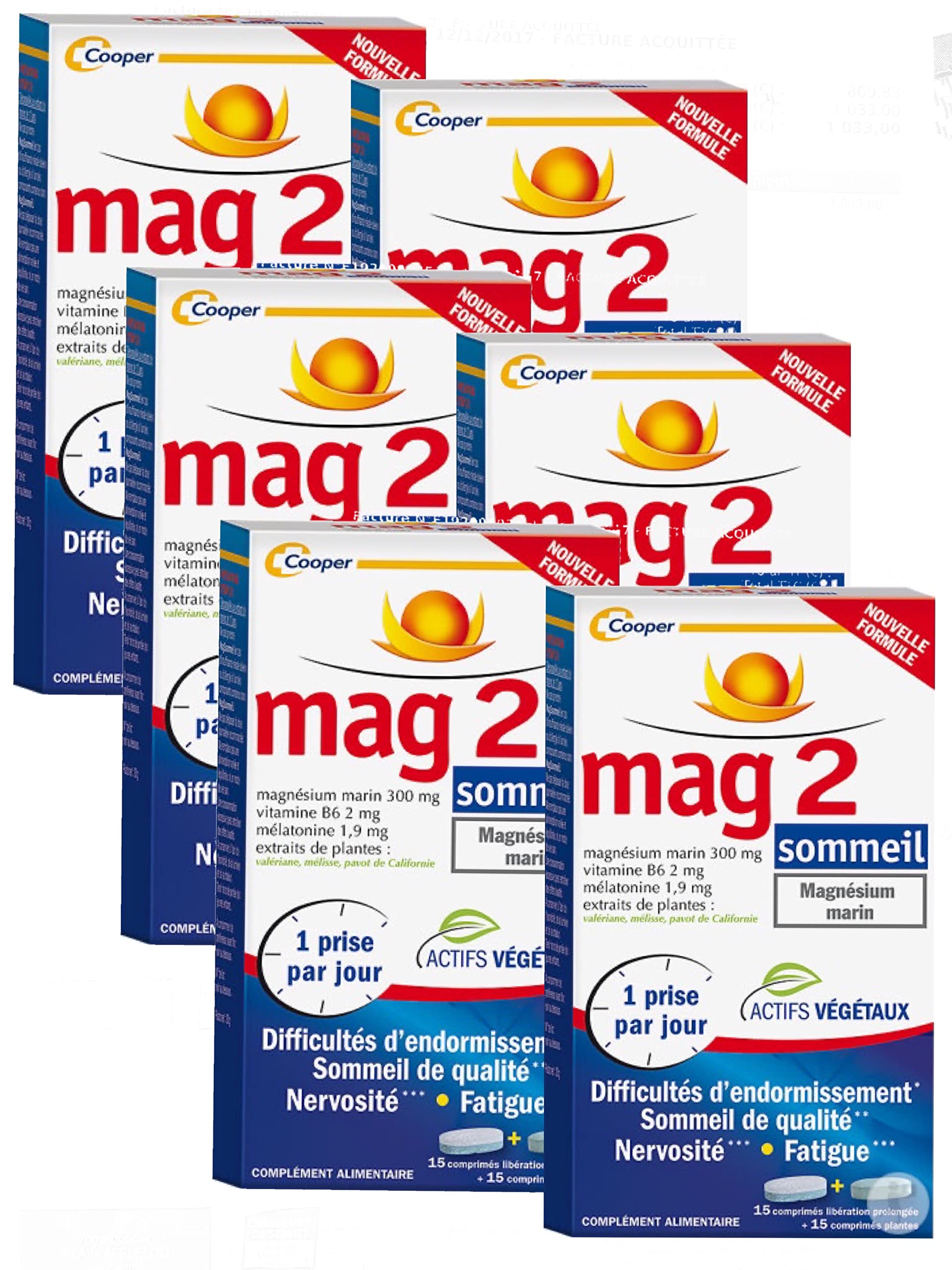 Magnesium is essential for the proper functioning of the body and an insufficient intake can cause nervousness and fatigue, which can cause difficulty falling asleep. Mag2sommeil, a complete formula: Daily intake of magnesium and vitamin B6 helps reduce fatigue and nervousness. Melatonin at 1.9 mg helps reduce the time it takes to fall asleep. The beneficial effect is obtained when taking 1 mg before bedtime. Valerian helps maintain natural sleep and normal sleep quality California poppy helps improve natural sleep quality and promotes relaxation Lemon balm helps maintain healthy sleep. Mag2sommeil's complete sleep formula has no known dependence at recommended doses. INGREDIENTS Tablet 1: Marine magnesium (magnesium oxide), anti-caking agents (microcrystalline cellulose, dicalcium phosphates, mono and diglycerides of fatty acids, magnesium salts of fatty acids, silicon dioxide [nano]. Bulking agents: hydroxypropylmethylcellulose, tricalcium phosphates, cocoa extract (Theobroma cacao, bean), vitamin B6 (pyridoxine hydrochloride), thickener: carboxymethylcellulose sodium, melatonin, coloring: indigo carmine. Tablet 2: Bulking agents: microcrystalline cellulose, silicon dioxide [nano], lemon balm extract (Melissa officinalis, aerial part), valerian extract (Valeriana officinalis, root). Cham., aerial part). Thickener: sodium carboxymethylcellulose Anti-caking agents: mono and diglycerides of fatty acids, magnesium salts of fatty acids, concentrated spirulina.Directions for use: Adults and adolescents. 2 tablets to be swallowed with a glass of water 30 minutes to 1 hour before bedtime. 1 Dosage: 1 Bi-layer tablet 1 tablet with Plant extracts. Valerian helps maintain natural sleep and normal sleep quality. California poppy helps improve the quality of natural sleep and promotes relaxation. Lemon balm helps maintain healthy sleep. The daily intake of magnesium and vitamin B6 helps reduce fatigue and nervousness. Melatonin at 1.9 mg helps reduce the time it takes to fall asleep. The beneficial effect is obtained when 1 mg is taken before bedtime. Mag2sommeil NEW FORMULA, a complete formula:. Le magnésium est indispensable au bon fonctionnement de l'organisme et un apport insuffisant peut être à l'origine de nervosité et de fatigue, pouvant engendrer des difficultés d'endormissement. Mag2sommeil, une formule complète : L'apport quotidien en magnésium et vitamine B6 permet de réduire l'état de fatigue et de nervosité. La mélatonine à hauteur de 1,9mg contribue à réduire le temps d'endormissement. L'effet bénéfique est obtenu pour la prise d'1 mg avant le coucher. La valériane aide à maintenir un sommeil naturel et une qualité de sommeil normale Le pavot de Californie contribue à améliorer la qualité du sommeil naturel et favorise la relaxation La mélisse aide à maintenir un sommeil sain. La formule complète pour le sommeil de Mag2sommeil est sans dépendance connue aux doses recommandées. INGRÉDIENTS Comprimé 1 : Magnésium marin (oxyde de magnésium), anti-agglomérants (cellulose microcristalline, phosphates dicalciques, mono et diglycérides d'acides gras, sels de magnésium d'acides gras, dioxyde de silicium [nano]. Agents de charge : hydroxypropylméthylcellulose, phosphates tricalciques, extrait de cacao (Theobroma cacao, fève), vitamine B6 (chlorhydrate de pyridoxine), épaississant : carboxyméthylcellulose de sodium, mélatonine, colorant : carmin d'indigo. Comprimé 2 : Agents de charge : cellulose microcristalline, dioxyde de silicium [nano], extrait de mélisse (Melissa officinalis, partie aérienne), extrait de valériane (Valeriana officinalis, racine). Agents d'enrobage : hydroxypropylméthylcellulose, acides gras, phosphates de calcium. Extrait de pavot de Californie (Eschscholzia californica Cham., partie aérienne). Epaississant : carboxyméthylcellulose de sodium. Anti-agglomérants : mono et diglycérides d'acides gras, sels de magnésium d'acides gras, spiruline concentrée.Conseils d'utilisation : Adultes et adolescents. 2 comprimés à avaler avec un verre d'eau 30 minutes à 1 heure avant le coucher. 1 Prise : 1 comprimé Bicouche 1 comprimé aux extraits de Plantes. La valériane aide à maintenir un sommeil naturel et une qualité de sommeil normale Le pavot de Californie contribue à améliorer la qualité du sommeil naturel et favorise la relaxation La mélisse aide à maintenir un sommeil sain. L'apport quotidien en magnésium et vitamine B6 permet de réduire l'état de fatigue et de nervosité. La mélatonine à hauteur de 1,9mg contribue à réduire le temps d'endormissement. L'effet bénéfique est obtenu pour la prise d'1 mg avant le coucher. Mag2sommeil NOUVELLE FORMULE, une formule complète:.