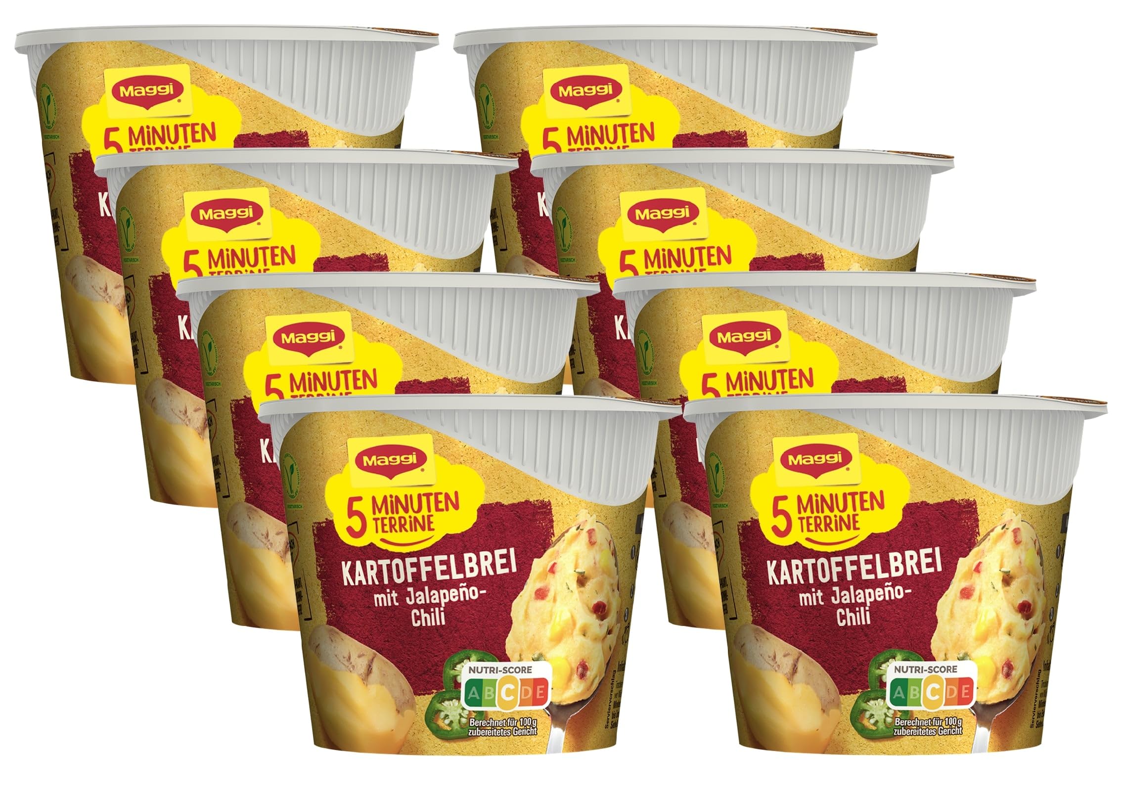 If things have to go quickly, Maggi is the perfect choice for 5 minutes Terrine Terrine Potato porridge with Jalapeño-Chili.Fine potato porridge with the savory note of the Jalapeño-Chili, plus paprika pieces, refined with aromatic spices-as usual in the practical cup.A break can be so delicious and practical: simply add boiling water and enjoy it in a few minutes. Maggi 5 minutes Terrine Potato porridge with Jalapeño-Chili;Creamy meets spicy Just came home from the office and get ready again for going to the cinema with friends?If it is quick and still be really tasty, the Maggi 5 minutes of terrine potato porridge with Jalapeño-Chili is just the thing Ingredients / ingredients Ingredients: 58.1% potatoes, palm fat, iodine salt (salt, potassium iodate), red paprika, yeast extract, milk sugar, spices (garlic, cayenne pepper, turmeric, cumin, pepper), corn, sugar, 0.4% jalapeño chilies, herbs, Sunflower oil, milk protein, flavors, acidic citric acid.Can contain gluten -containing grain, eggs, soy, celery and mustard. Instructions Only 3 steps to enjoy: 1. Pour boiling water up to the filling line.2. Stir directly.3. Wait only 5 minutes and you're done! Address manufacturer/importer 78221 Singen (Hohentwiel) Germany More creamy & crisp: the ideal, quick strengthening for potato lovers, with the best potatoes and jalapeño chili-always tastes super tasty.Simply & fast: the preparation could not be easier - pour boiling water up to the filling line into the cup and let it stir for 5 minutes with occasionally stirring stirring.Little time out: Take a MAGGI 5 minutes of terrine potato porridge with Jalapeño -Chili out of the closet and enjoy a hearty potato dish within 5 minutes - delicious snack despite everyday stress.Always & anywhere: Wherever the stomach growls - whether at home, on the go or in the office - the Maggi 5 minutes Terrine potato porridge with Jalapeño -Chili can be prepared easily and quickly. Wenn es schnell gehen muss, ist MAGGI 5 Minuten Terrine Kartoffelbrei mit Jalapeño-Chili die perfekte Wahl. Feiner Kartoffelbrei mit der pikanten Note der Jalapeño-Chili, dazu Paprikastückchen, verfeinert mit aromatischen Gewürzen - wie gewohnt im praktischen Becher. So köstlich und praktisch kann eine Auszeit sein: Einfach kochendes Wasser hinzugeben und in wenigen Minuten genießen. MAGGI 5 Minuten Terrine Kartoffelbrei mit Jalapeño-Chili; cremig trifft pikant Gerade vom Büro nach Hause gekommen und gleich schon wieder fertigmachen für den Kinobesuch mit Freunden? Wenn´s schnell gehen und trotzdem wirklich lecker sein soll, ist die MAGGI 5 Minuten Terrine Kartoffelbrei mit Jalapeño-Chili genau das Richtige INHALTSSTOFFE / ZUTATEN Zutaten: 58,1% Kartoffeln, Palmfett, Jodsalz (Salz, Kaliumjodat), rote Paprika, Hefeextrakt, MILCHZUCKER, Gewürze (Knoblauch, Cayennepfeffer, Kurkuma, Kreuzkümmel, Paprika), Mais, Zucker, 0,4% Jalapeño-Chilies, Kräuter, Sonnenblumenöl, MILCHEIWEISS, Aromen, Säuerungsmittel Citronensäure. Kann GLUTENHALTIGES GETREIDE, EIER, SOJA, SELLERIE und SENF enthalten. GEBRAUCHSANWEISUNG Nur 3 Schritte zum Genuss: 1. Kochendes Wasser bis zur Fülllinie aufgießen. 2. Direkt kräftig umrühren. 3. Nur noch 5 Min. warten und fertig! ANSCHRIFT HERSTELLER/IMPORTEUR 78221 Singen (Hohentwiel) DEUTSCHLAND MehrCremig & knackig: die ideale, schnelle Stärkung für Kartoffel-Liebhaber, mit besten Kartoffeln und Jalapeño-Chili - schmeckt immer super lecker. Einfach & schnell: die Zubereitung könnte nicht einfacher sein - kochendes Wasser bis zur Fülllinie in den Becher gießen und 5 Minuten unter gelegentlichem umrühren ziehen lassen, fertig. Kleine Auszeit: nimm eine MAGGI 5 Minuten Terrine Kartoffelbrei mit Jalapeño-Chili aus dem Schrank und genieße innerhalb von 5 Minuten ein herzhaftes Kartoffelgericht - leckerer Snack trotz Alltagsstress. Immer & überall: wo auch immer der Magen knurrt - ob Zuhause, unterwegs oder im Büro - die MAGGI 5 Minuten Terrine Kartoffelbrei mit Jalapeño-Chili lässt sich einfach und schnell zubereiten.MAGGI 5 Minuten Terrine Kartoffelbrei mit Jalapeño-Chili, 8er Pack (8 x 42g)