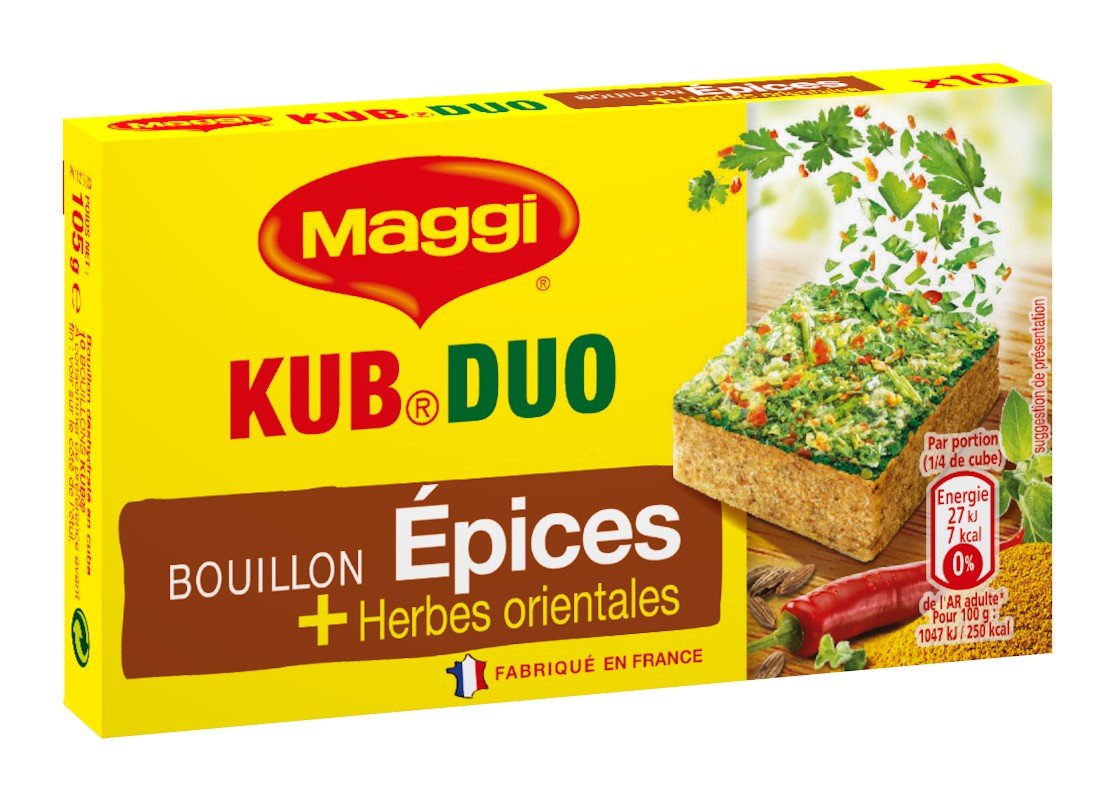 The little gesture that makes all the difference! MAGGI Kub Duo broths add flavor and enhance all your dishes. Prepared with carefully selected oriental spices and herbs, MAGGI KUB DUO pairs perfectly with your vegetable, meat, pasta and rice dishes. For a cuisine full of benefits, give your everyday dishes a good cooked taste and a nice touch of color INGREDIENTS Salt, flavor enhancers: monosodium glutamate, disodium inosinate and guanylate glucose syrup, non-hydrogenated palm oil , vegetables 5.2 : onion, carrot potato starch, sunflower oil, spices 1.6 : coriander, turmeric, cumin, chili aromatic herbs: parsley, coriander 0.2 , oregano 0.1 sugar, flavorings, natural pepper extract, caramelized sugar. More info at www.maggi.fr hdp May contain traces of: milk, egg, wheat, celery, mustard. DIRECTIONS FOR USE Cooking in water (soups, pasta, rice): 1 or 2 cubes in 1 liter of boiling water. Cooking in a casserole dish: 1 cube in 25 cl of boiling water. No need to add salt. Tip: Perfect for adding a subtle spicy note (coriander, turmeric, and cumin) to all your tagine recipes couscous, or even ratatouille! For a cuisine full of benefits give your everyday dishes a good cooked taste and a nice touch of color. Prepared with carefully selected oriental spices and herbs KUB DUO MAGGI goes perfectly with your vegetable dishes meats pasta and rice. Discover the unique double-layer broth KUB DUO Oriental Spices and Herbs A 100 vegetable broth that combines the best of broth with a layer of aromatic herbs for a fresher and more intense taste! Le petit geste qui change tout ! Les bouillons Kub Duo MAGGI apportent du goût et embellissent tous vos plats. Préparé avec des épices et des herbes orientales soigneusement sélectionnées, KUB DUO MAGGI se marie parfaitement à vos plats de légumes, viandes, pâtes et riz. Pour une cuisine pleine de bienfaits, offrez à vos plats de tous les jours un bon goût cuisiné et une belle touche de couleur INGRÉDIENTS Sel, exhausteurs de goût : glutamate monosodique, inosinate et guanylate disodiques sirop de glucose, huile de palme non hydrogénée , légumes 5,2 : oignon, carotte fécule de pomme de terre, huile de tournesol, épices 1,6 : coriandre, curcuma, cumin, piment herbes aromatiques : persil, coriandre 0,2 , origan 0,1 sucre, arômes, extrait naturel de poivre, sucre caramélisé. Plus d'infos sur www.maggi.fr hdp Peut contenir des traces de : lait, œuf, blé, céleri, moutarde. MODE D'EMPLOI Cuisson à l'eau (soupes, pâtes, riz) : 1 ou 2 cubes dans 1 litre d'eau bouillante. Cuisson à la cocotte : 1 cube dans 25 cl d'eau bouillante. Inutile de saler. Astuce: parfait pour apporter une subtile note épicée (coriandre curcuma et cumin) à toutes vos recettes de tajines couscous ou encore dans vos ratatouilles !. Pour une cuisine pleine de bienfaits offrez à vos plats de tous les jours un bon goût cuisiné et une belle touche de couleur. Préparé avec des épices et des herbes orientales soigneusement sélectionnées KUB DUO MAGGI se marie parfaitement à vos plats de légumes viandes pâtes et riz. Découvrez l'unique bouillon double couche KUB DUO Epices et Herbes orientales Un bouillon 100 végétal qui allie le meilleur du bouillon à une couche d'herbes aromatiques pour un goût plus frais et plus intense !.