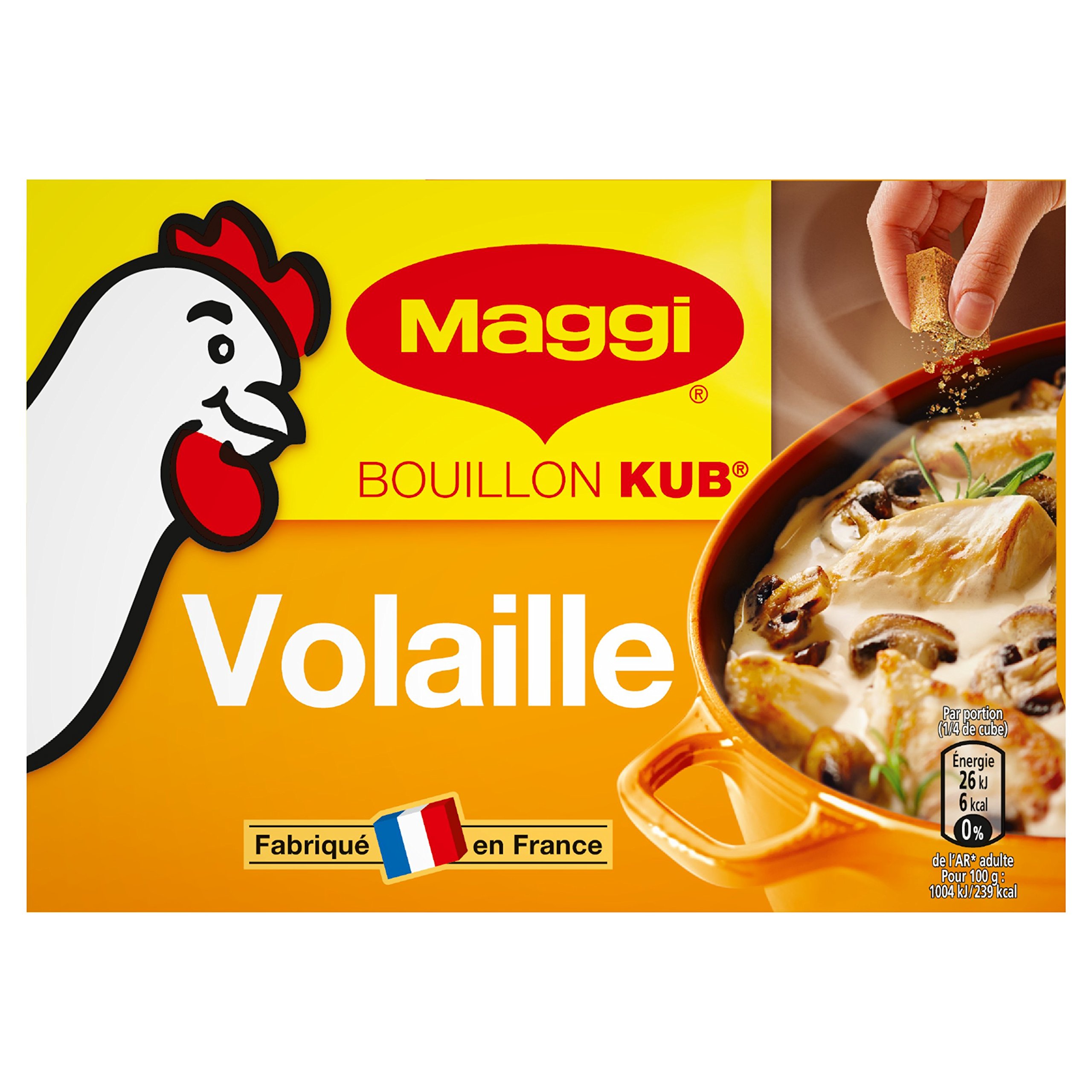 INGREDIENTS Salt, flavor enhancer: monosodium glutamate, disodium inosinate and guanylate non-hydrogenated palm oil INSTRUCTIONS FOR USE Cooking with water (for soups, pasta, rice, vegetables.) 2 cubes 1 liter of boiling water. Cooking with casserole (for 500-600 g meat, vegetables and or starchy): 1 cube 1 4 liter of boiling water. Cooking in a pan (for 800 g meat, fish, vegetables and or starchy foods): 1 stock, crumbled directly in the pan. No salt needed.Maggi Kub gevogelte (18 tabs), 180 g, 5 stuks INGREDIËNTEN Zout, smaakversterker: mononatriumglutamaat, dinatriuminosinaat en guanylaat niet-gehydrogeneerde palmolie GEBRUIKSAANWIJZING Koken met water (voor soepen, pasta, rijst, groenten.) 2 blokjes 1 liter kokend water. Koken met braadpan (voor 500-600 g vlees, groenten en of zetmeelrijk): 1 kubus 1 4 liter kokend water. Koken in een pan (voor 800 g vlees, vis, groenten en of zetmeelrijk voedsel): 1 bouillon, verkruimeld direct in de pan. Geen zout nodig.