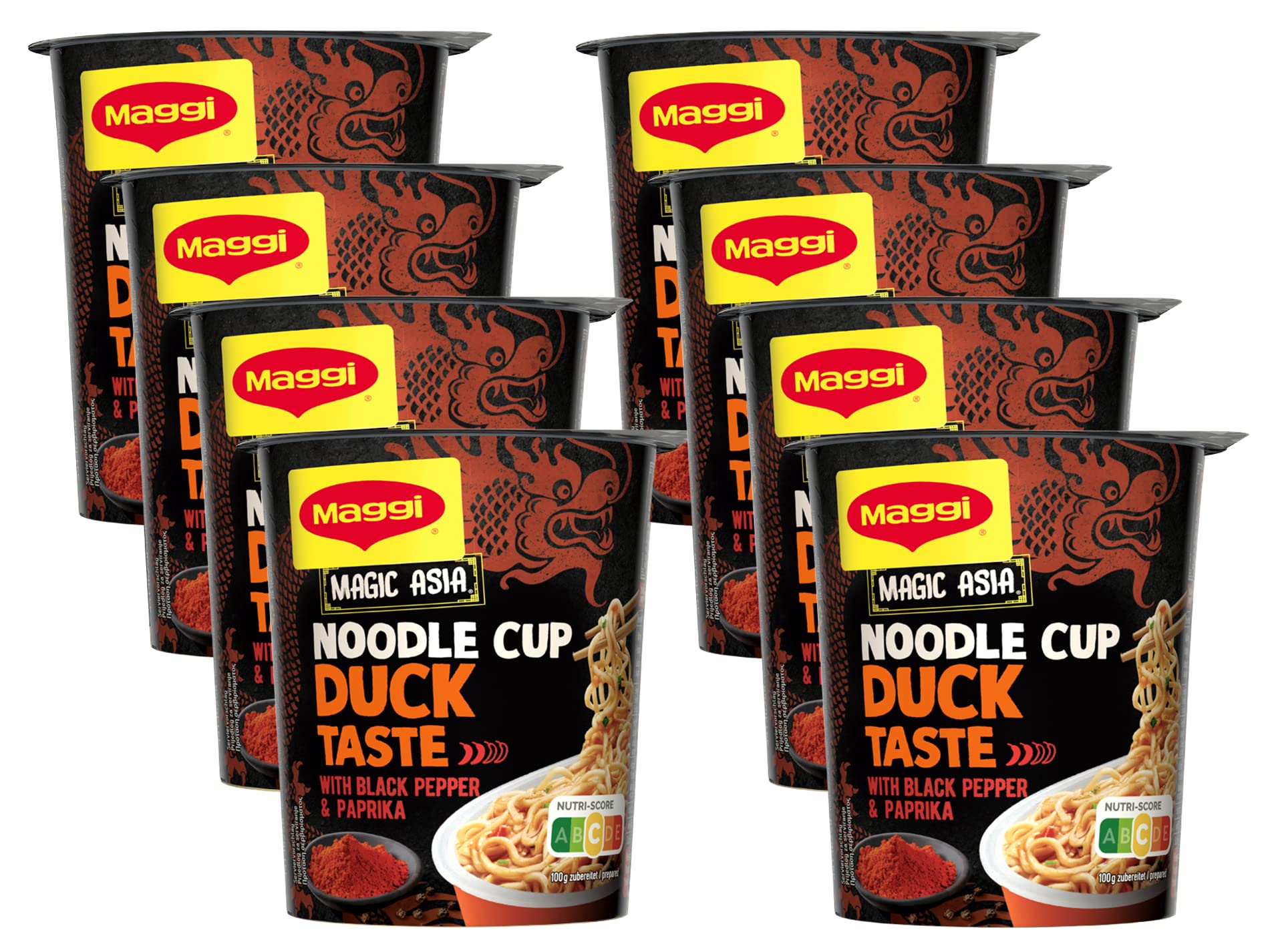 Would you like a noodle snack with a duck taste, but not to stand in the kitchen for a long time?With the Maggi Maggi Magic Asia Noodle Cup Duck, delicious Asian noodles with duck taste are prepared in no time.Use the Asian snack variations for lunch break, on the campsite or as a small meal for in between.Just off the lid and off you go!Maggi Magic Asia Noodle Cup Duck tastes always and everywhere Magic Asia Noodle Cups from Maggi are ideal for the break and the little hunger in between.Why go to the Asia snack?For Asian pasta with duck taste, all you need is a little boiling water, a spoon and a mug Maggi Magi Magic Asia Noodle Cup Duck.The practical mug with the delicious noodle snack is the ideal meal for on the go and the quick kitchen while relaxing on the couch and on the campground. Ingredients / ingredients Ingredients: 87.3 % fried noodles [wheat flour, sunflower, wheat gluts, salt, acid -carator potassium carbonate, stabilizer polyphosphate], salt, carrots, onions, leeks, spices (garlic, chilli, pepper, pepper, coriander, ginger), herbs (parsley, Chives), natural flavors, duck aroma, yeast extract, caramel sugar syrup, aroma (with wheat), sunflower, sugar. Instructions This is how it is done:#1.Remove cover.Add vegetable-herb mix + seasoning.#2.Pour boiling water up to the filling line.#3.4 min.to let go.Stir occasionally.Ready.#Tip: Size to taste. Address manufacturer/importer 78221 Singen (Hohentwiel) More you need: boiling water and a spoon.Prepared quickly and easily.The ideal snack if you have to go quickly.Asia style with typical spicy duck taste, refined with vegetables and herbs.Results in a delicious portion. Lust auf einen Nudelsnack mit Enten-Geschmack, aber keine Zeit lange in der Küche zu stehen? Mit dem MAGGI Magic Asia Noodle Cup Duck werden leckere asiatische Nudeln mit Enten-Geschmack im Nu zubereitet. Nutze die asiatischen Snack-Variationen für die Mittagspause, auf dem Campingplatz oder als kleine Mahlzeit für zwischendurch. Einfach Deckel ab und los geht’s! MAGGI Magic Asia Noodle Cup Duck schmeckt immer und überall Magic Asia Noodle Cups von MAGGI sind Ideal für die Pause und den kleinen Hunger zwischendurch. Warum zum Asia-Imbiss gehen? Für asiatische Nudeln mit Enten-Geschmack braucht man nur etwas kochendes Wasser, einen Löffel und einen Becher MAGGI Magic Asia Noodle Cup Duck. Der praktische Becher mit dem leckeren Nudelsnack ist das Ideale Essen für unterwegs und die schnelle Küche beim Entspannen auf der Couch und auf dem Zeltplatz. INHALTSSTOFFE / ZUTATEN Zutaten: 87,3 % frittierte Nudeln [WEIZENMEHL, Sonnenblumenol, WEIZENGLUTEN, Salz, Säureregulator Kaliumcarbonat, Stabilisator Polyphosphate], Salz, Karotten, Zwiebeln, Lauch, Gewürze (Knoblauch, Chili, Pfeffer, Paprika, Koriander, Ingwer), Kräuter (Petersilie, Schnittlauch), naturliche Aromen, Entenaroma, Hefeextrakt, Karamellzuckersirup, Aroma (mit WEIZEN), Sonnenblumenol, Zucker. GEBRAUCHSANWEISUNG SO WIRD'S GEMACHT:#1. Deckel entfernen. GEMÜSE-KRÄUTER-MIX + WÜRZUNG hinzugeben.#2. KOCHENDES Wasser bis zur Fülllinie aufgießen.#3. 4 MIN. ziehen lassen. Dabei gelegentlich umrühren. FERTIG.#Tipp: Würzung nach Geschmack dosieren. ANSCHRIFT HERSTELLER/IMPORTEUR 78221 Singen (Hohentwiel) MehrDas braucht man dazu: Kochendes Wasser und einen Löffel. Schnell und unkompliziert zubereitet. Der ideale Snack, wenn’s schnell gehen muss. Asia-Style mit typisch würzigem Enten-Geschmack, verfeinert mit Gemüse und Kräuter Stückchen. Ergibt eine leckere Portion.MAGGI Magic Asia Noodle Cup Duck, Instant-Nudeln mit Enten-Geschmack, leckeres Fertiggericht im praktischen Becher, mit Gemüse verfeinert, 8er Pack (8x63g) Duck Single
