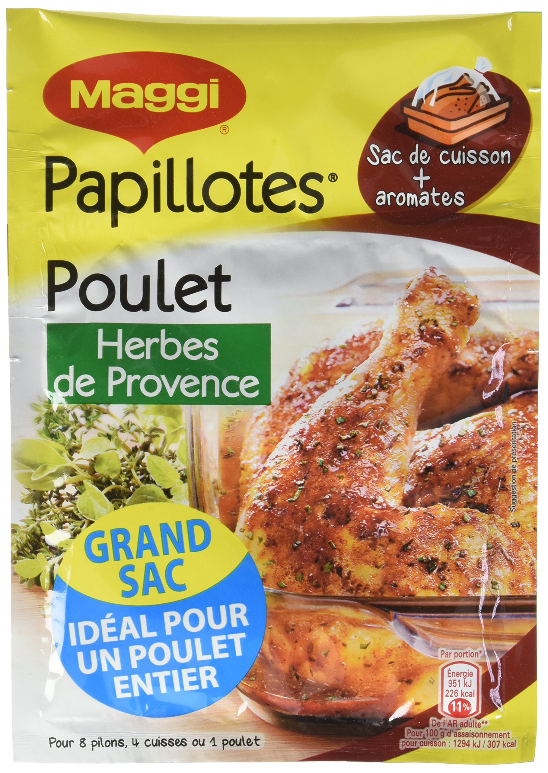 Reinvent your everyday dishes with PAPILLOTES from MAGGI and its subtle blend of herbs and spices! You are sure to achieve delicious, tender and juicy chicken without adding fat. Fall for PAPILLOTES Poulet Herbes de Provence from MAGGI and make, in just 3 steps, a tasty chicken, with intense notes of Herbes de Provence enhanced with a hint of garlic. INGREDIENTS Vegetables 29 : potato, tomato, onion 5 , parsnips salt, Provence herbs 9 : oregano, marjoram, basil, thyme cornstarch, paprika, garlic, sugar, coriander, sunflower oil, ginger, parsley, pepper, concentrated lemon juice, turmeric, chili pepper, flavorings. May contain: milk, egg, soy, wheat, celery, mustard. DIRECTIONS FOR USE For 8 drumsticks, 4 thighs or 1 chicken weighing approximately 1.2 kg. Preheat your oven to th 7 (200 C) in traditional mode or th 6 (180 C) in the gas oven. Place the meat in the unfolded bag. Sprinkle the seasoning evenly. Shake gently to distribute the preparation evenly. Add 5 tablespoons or 60 ml of water. Close the bag with the clip provided. Shake gently again. In a suitable dish, cook on a rack: around 45 minutes for drumsticks, 55 minutes for thighs, 1 hour 10 minutes for chicken, at the bottom of the oven in an electric oven, in the middle in a gas oven. (In convection heat mode, save 10 minutes on the cooking times indicated). Open the bag, being careful not to burn yourself with the steam, remove the chicken with its juices. Mix, it's ready! No need to add salt. SAFETY WARNING Do not let children play with the cooking bag. Do not use the grill function of the oven or the microwave to cook meat. The bag must not touch the resistance or the walls of the oven. A large bag specially designed for cooking chicken in the oven. No need to add salt. No artificial colors or preservatives. No added fat. Ideal for guaranteed delicious, tender, and juicy chicken. Réinventez vos plats du quotidien avec PAPILLOTES de MAGGI et son subtil mélange d'herbes et d'épices ! Vous réussirez à coup sûr un poulet délicieux, tendre et juteux sans ajouter de matières grasses. Craquez pour PAPILLOTES Poulet Herbes de Provence de MAGGI et réalisez, en seulement 3 étapes, un poulet savoureux, aux notes intenses d'herbes de Provence réhaussées d'une pointe d'ail. INGRÉDIENTS Légumes 29 : pomme de terre, tomate, oignon 5 , panais sel, herbes de Provence 9 : origan, marjolaine, basilic, thym fécule de maïs, paprika, ail, sucre, coriandre, huile de tournesol, gingembre, persil, poivre, jus de citron concentré, curcuma, piment, arômes. Peut contenir : lait, œuf, soja, blé, céleri, moutarde. MODE D'EMPLOI Pour 8 pilons, 4 cuisses ou 1 poulet d'environ 1,2 kg. Préchauffez votre four à th 7 (200 C) en mode traditionnel ou th 6 (180 C) au four à gaz. Déposez la viande dans le sac déplié. Saupoudrez de manière homogène l'assaisonnement. Secouez délicatement pour bien répartir la préparation. Ajoutez 5 cuillères à soupe ou 60 ml d'eau. Fermez le sac avec l'attache fournie. Secouez délicatement à nouveau. Dans un plat adapté, faites cuire sur une grille : env 45 minutes pour des pilons, 55 minutes pour des cuisses, 1h10 pour un poulet, en bas de four au four électrique, au milieu au four à gaz. (En mode chaleur tournante, gagnez 10 minutes sur les temps de cuisson indiqués). Ouvrez le sac en faisant attention de ne pas vous brûler avec la vapeur, sortez le poulet avec son jus. Mélangez, c'est prêt ! Inutile de saler. AVERTISSEMENT DE SÛRETÉ Ne pas laisser les enfants jouer avec le sac de cuisson.Ne pas utiliser la fonction grill du four, ni le micro-ondes pour la cuisson de la viande. Le sac ne doit pas toucher la résistance ni les parois du four. Un grand sac spécialement conçu pour la cuisson du poulet au four. Inutile de saler. Sans colorant et sans conservateur. Sans ajouter de matières grasses. Idéal pour réussir à coup sûr un poulet délicieux tendre et juteux.