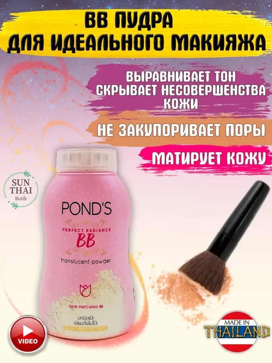 Хит продаж! Матирующая пудра прекрасного качества, заслуживающая огромное количество положительных отзывов! BB пудра это спасение для жирной кожи лица. Ровная, матовая кожа, которая будто бы светится изнутри - таков результат работы волшебной ВВ пудры! Имеющая экономичную формулу, приятную цену, и, самое главное, магическое действие, тайская пудра станет находкой для каждой модницы и красавицы! Рассыпчатая Пудра бежевого оттенка равно ложится на кожу, не забивается в морщинки и поры. Разглаживает кожу, не оставляет ощущения сухости и стянутости. Выравнивает тон лица, подстраивается по ваш естественный оттенок кожи. Не образует маску, придает лицу свежесть и бархатистость. Может быть использована для ежедневного естественного макияжа. Пудра матирующая остается незаметной, кожа выглядит ровной и здоровой. Хорошо матирует. Рассыпчатая BB пудра Pond's Magic powder имеет приятный свежий запах, который быстро исчезает. Содержит никотиновую кислоту, которая борется с воспалениями кожи и подсушивает прыщики. Средство имеет очень мелкий, шелковистый помол, который не забивает поры и очень естественно ложится, моментально выравнивая лицо и подстраиваясь под его тон. Кисть с небольшим количеством пудры работает, как волшебная палочка: по легкому движению руки уходит усталость, несовершенства, жирный блеск, появляется кукольная фарфоровость и благородное мерцание, выгодно подчеркивающее лицо при разном освещении. Приятным бонусом станет защита от Ультра Фиолетовых лучей, которая надежно защитит кожу от старения. Подчеркните свою красоту, будьте неотразимы в любой ситуации. Эффект от применения матирующей пудры: выравнивает тон, скрывает несовершенства кожи, обеспечивает естественное натуральное покрытие освежает тон, делая его сияющим и отдохнувшим, матирует кожу, повышает упругость и эластичность кожи, защищает от воспалений, жирного блеска и УФ лучей, придаёт здоровое сияниене закупоривает поры, позволяет коже дышать.