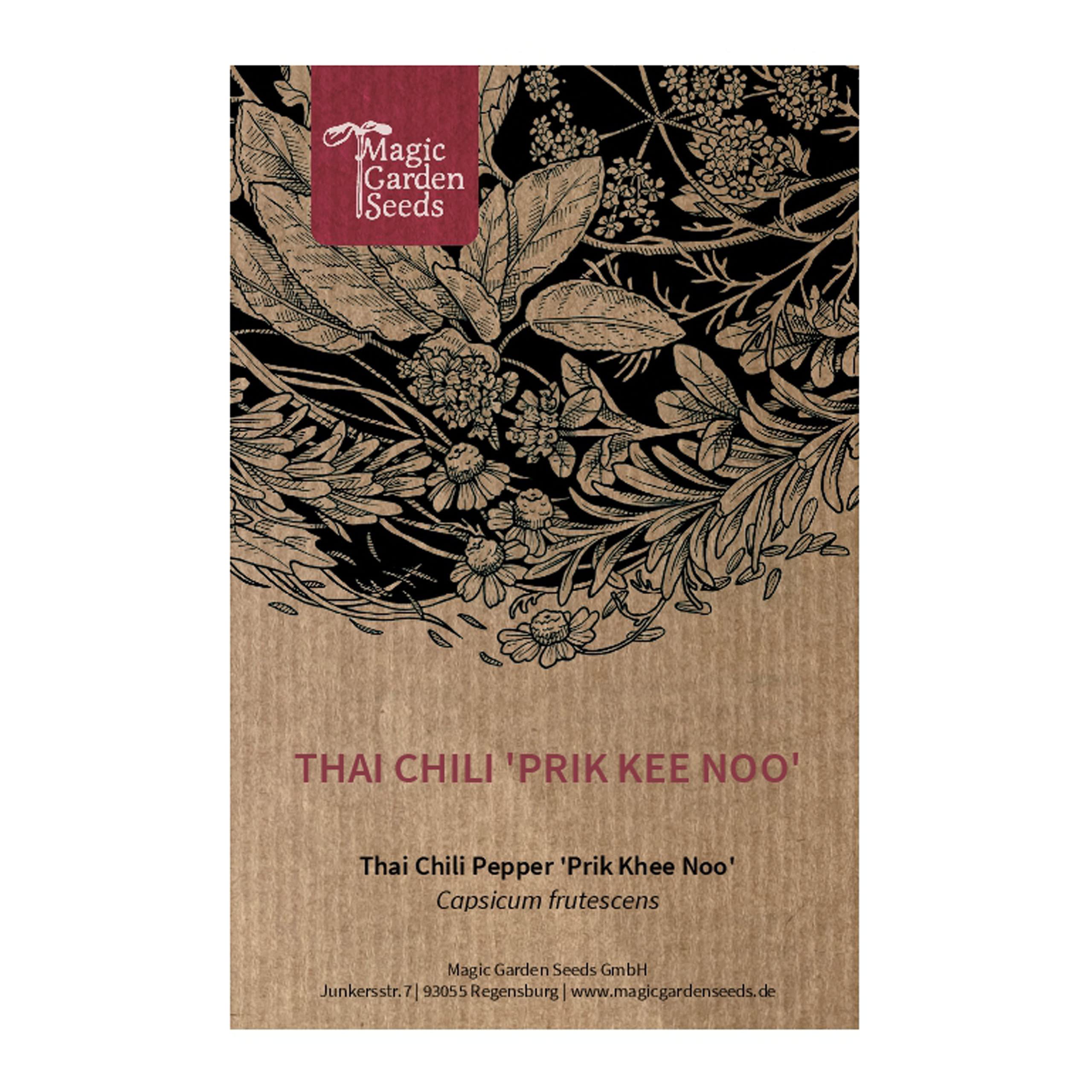 The so-called 'bird's eye chili' is quite typical of Thai cuisine. The small very hot chili peppers are used to flavor the curry pastes. From vegetables, herbs and medicinal plants to tree seeds or ethnobotanical rarities, in the Magic Garden Seeds range you will find seeds for unusual plants - traditional or exotic, particularly high-yielding or simply beautiful, time-tested or almost forgotten. All our seeds are completely reproducible. This means you can use them for growing and harvesting seeds. We do not have F1 hybrids or varieties produced by genetic engineering, but only original, seed-resistant seeds - a contribution to the diversity and biodiversity in the garden. Our seed packs each contain seed portions that you can use to start your own growing program. For very large seeds, such as pumpkin or cucumber seeds, the quantity is slightly smaller due to the greater space required.ABOUT US Magic Garden Seeds offers seeds from unusual plants - traditional or exotic - particularly productive or simply beautiful, time-tested or almost forgotten. SHELF LIFE The date on the seed bags is the filling date and not the expiration date. Depending on the plant species, seeds can be stored for one to many years. QUALITY The packaging may differ from the packaging in the photo. All are available in German and English. SEED STABLE VARIETIES High germination capacity, (no hybrid seed), one bag of seed per variety. Seed portion with approx. 10 seeds per packet. SEED The so-called 'bird's eye chili' is quite typical of Thai cuisine. The small very hot chili peppers are used to flavor the curry pastes.Thaise chilipeper 'Prik Kee Noo' (Capsicum frutescens) - ca. 10 zaden De zogenaamde 'bird's eye chili' is vrij typerend voor de Thaise keuken. De kleine zeer hete chilipepers worden gebruikt om de currypasta's op smaak te brengen. Van groenten, kruiden en medicinale planten tot boomzaden of etnobotanische zeldzaamheden, in het Magic Garden Seeds assortiment vindt u zaden voor ongewone planten - traditioneel of exotisch, bijzonder hoogproductief of gewoon mooi, beproefd of bijna vergeten. Al onze zaden zijn volledig reproduceerbaar. Dit betekent dat je ze kunt gebruiken voor het kweken en oogsten van zaden. Wij hebben geen F1 hybriden of soorten die door genetische manipulatie zijn geproduceerd, maar alleen originele, zaadresistente zaden - een bijdrage aan de diversiteit en biodiversiteit in de tuin. Onze zaadverpakkingen bevatten elk zaadporties die je kunt gebruiken om je eigen kweekprogramma te starten. Voor zeer grote zaden, zoals pompoen- of komkommerzaden, is de hoeveelheid iets kleiner vanwege de grotere benodigde ruimte.OVER ONS Magic Garden Seeds biedt zaden van ongewone planten - traditioneel of exotisch - bijzonder productief of gewoon mooi, vanouds beproefd of bijna vergeten. HOUDBAARHEID De datum op de zaadzakjes is de vuldatum en niet de houdbaarheidsdatum. Afhankelijk van de plantensoort kunnen zaden één tot vele jaren worden bewaard. KWALITEIT De verpakking kan afwijken van de verpakking op de foto. Alle zijn beschikbaar in het Duits en Engels. ZAADSTABIELE RASSEN Hoge kiemkracht, (geen hybride zaad), één zakje zaad per ras. Zaad portie met ca. 10 zaden per pakje. ZAAD De zogenaamde 'bird's eye chili' is vrij typerend voor de Thaise keuken. De kleine zeer hete chilipepers worden gebruikt om de currypasta's op smaak te brengen.