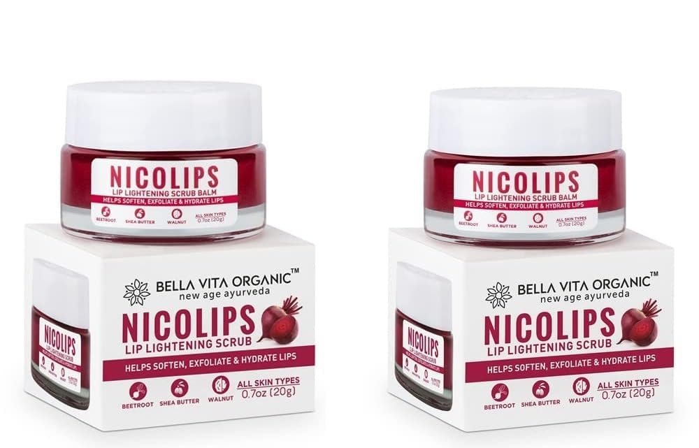 Pack Of 2 Bella Vita Organic NicoLips Lip Balm Scrub For Lightening Brightening Dark Lips For Men Women, 20g Natural ingredients moisturize, hydrate and heal lips. Walnut granules remove dead and dry skin, leaving your lips soft and plump, Benefits: Brightens, brightens and softens lips. Gently exfoliates dry, chapped lips. Prevents lip darkening and makes lips supple. Hydrates and heals dry, chapped lips, Beetroot is an antioxidant that has natural whitening properties that lighten dark lips, NicoLips designed to suit all skin types and all genders. It is also a perfect natural lip scrub for smokers to get rid of dark spots caused by smoking, This gentle lip scrub is the best lip scrub for dark lips as it reduces pigmentation and tan from them and gives you bright pink lips
