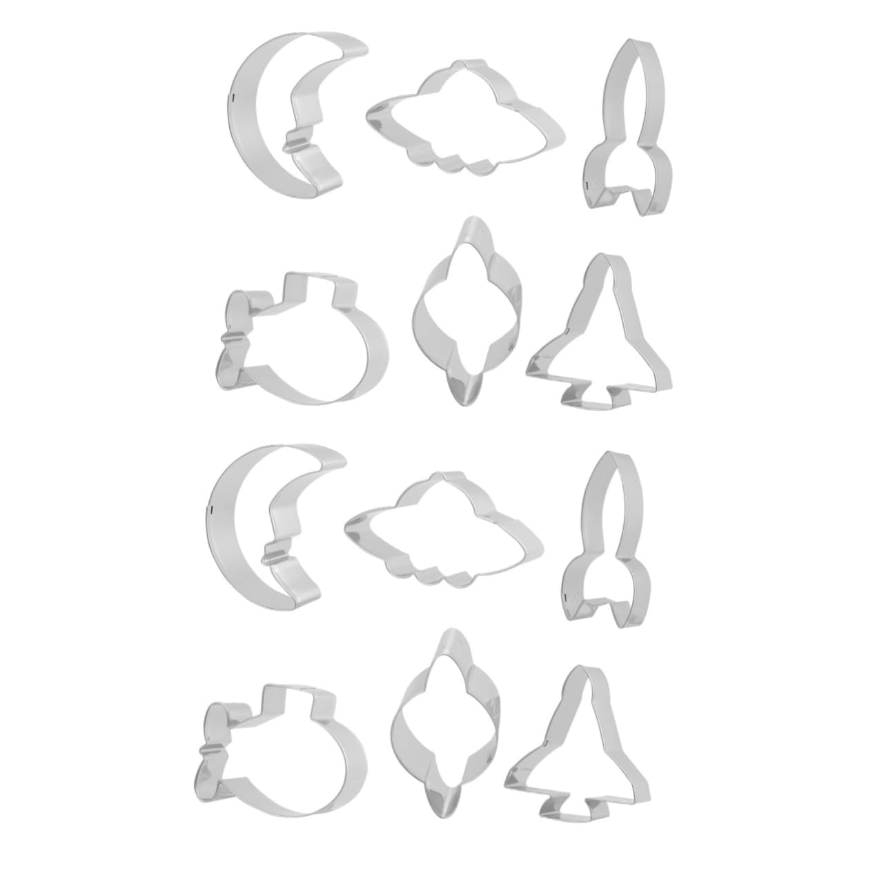 Package List 12 x Cookie Mold Features - Warm Tip: Dear buyer, due to lighting effect, monitor's brightness, manual measurement, etc., there could be some slight differences in the color and size between the photo and the actual item stainless steel molds. - Material: Stainless steel cake baking mold. - Note: Including moon, planet, spaceship, flying saucer, rocket, balloon 6 different patterns cake . - Color: Silver. - Size: 9 x 4 x 2.5 cm. - Creative and unique cosmic themed shape designed molds, perfect for making and heartwarming cookies, chocolates and cakes for your beloved one on that special day cookies mold. - Suitable for making cookies, mousse, sponge cake, chocolate, fondant, cutting vegetables and fruit, cutting the cake into lovely shapes, and even making rice roll, etc stainless steel cookie . - stainless steel material, thicken, anti-rust, safe and reliable use fondant . - Easy to clean, for home or professional cake shop baking use. - Non-stick, easy and quick to demould with keeping the DIY cookie or chocolate intact in shape. Goods Description cake mold Design of cosmic themed shapes, very interesting, makes gastronomy more fun.stainless steel molds It is made of premium stainless steel material, environmental protection, thicken and non-stick.stainless steel cookie Suitable for making fondant, cake, chocolate, candy, ice cube, jelly or any crafts you can imagine.cake With it, you can make fondant, cake with easeCake baking mold-- easy to clean, for home or professional cake shop baking use. Fondant -- suitable for making cookies, mousse, sponge cake, chocolate, fondant, cutting vegetables and fruit, cutting the cake into lovely shapes, and even making rice roll, etc. Cake mold-- stainless steel material, thicken, anti-rust, safe and reliable use. Stainless steel molds-- non-stick, easy and quick to demould with keeping the DIY cookie or chocolate intact in shape. Stainless steel cookie -- creative and unique cosmic themed shape designed molds, perfect for making and heartwarming cookies, chocolates and cakes for your beloved one on that special day.