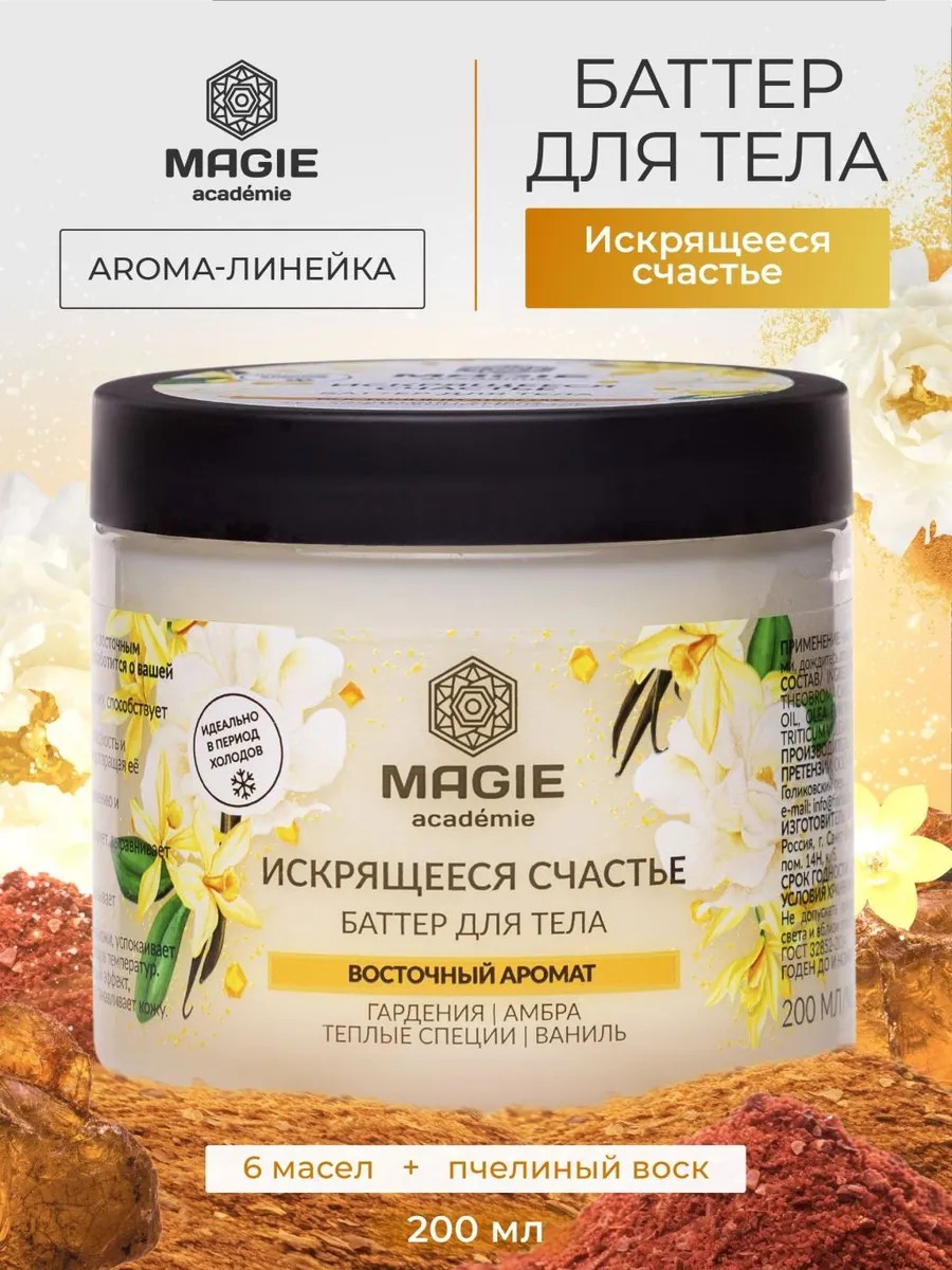 Крем - Баттер для тела Искрящееся счастье Российского бренда уходовой косметики для женщин Magie Academie - это истинное воплощение роскоши и ухода. Обогащенный натуральными компонентами, увлажняющий крем предлагает непревзойденное питание, увлажнение и восстановление. Масло ши интенсивно питает и смягчает, успокаивает кожу. Масло какао увлажняет и тонизирует, придает гладкость и упругость, поддерживает гидролипидный баланс, предотвращая пересыхание и растрескивание. Пчелиный воск смягчает и помогает заживлению, не закупоривает поры. Масло арганы и виноградных косточек выравнивают цвет и тон, повышают упругость и эластичность, способствуют регенерации клеток, эффективно защищают от ветра, морозов, перепадов температур. Масло оливы и ростков пшеницы спасают от сухости и обезвоживания, оказывают омолаживающий эффект, обогащают витамином Е и восстанавливают. Нежная текстура мгновенно впитывается, оставляя кожу увлажненной, шелковистой и невероятно гладкой. Погрузитесь в мир удовольствия и заботы с нашим брендом мажи академи!