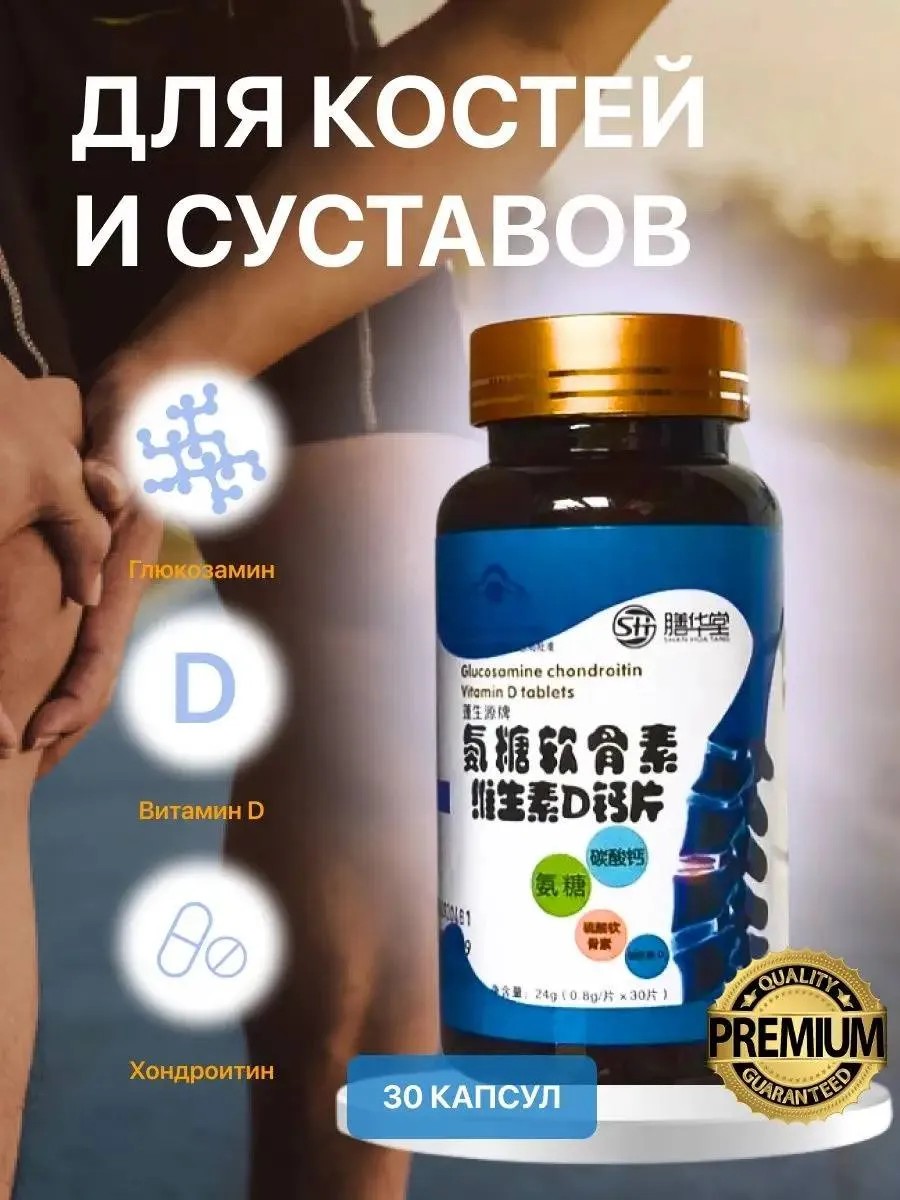 Таблетки глюкозамин хондроитин с витамином Д снимает воспаления боль отечность восстанавливает 30 шт. Капсулы глюкозамин хондроитин с витамином D - надежный и проверенный препарат, предназначенный для лечения и профилактики остеоартроза, а также других серьезных заболеваний опорно-двигательной и костно-мышечной систем организма. Средство представляет собой незаменимую поддержку для соединительных тканей, суставов, хрящей, мышц и связок. Препарат chondroitin glucosamine эффективно предупреждает дегенерацию и воспалительные процессы, увеличивает прочность хрящей и суставов, придает им упругость и гибкость, снимает боль, уменьшает мышечную утомляемость и возвращает легкость движений. Обеспечивает восстановление хрящевой ткани и быструю регенерацию при повреждениях, вызванных нарушенным обменом веществ, повышенными физическими нагрузками, возрастными изменениями или травмами. Показания к применению: артроз, остеохондроз остеоартроз судороги мышечные боли ушибы, растяжения, радикулит. Способ применения и дозы: 2 раза в день по 2 таблетки после приема пищи.