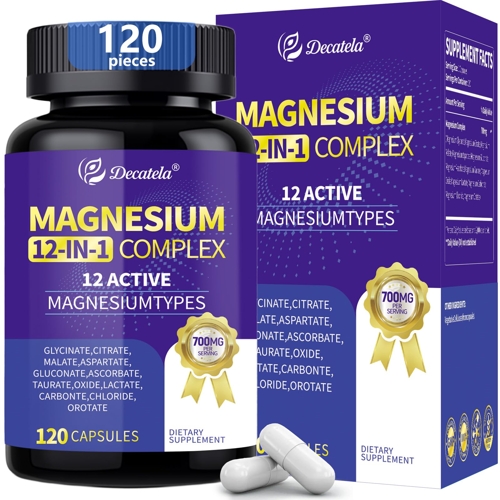 EXCEPTIONAL VALUE EFFORTLESS INTEGRATION: Enjoy the convenience of a generous 120-capsule supply, One pill per day, offering a full 120 days of premium magnesium supplementation, seamlessly supporting your sustained health journey with every easy-to-swallow capsule. GENTLE, CERTIFIED PURITY : Crafted as Non-GMO, Vegan, Gluten-Free, and Soy-Free rigorously third-party lab tested for potency in a GMP facility. Free from fillers, artificial ingredients, or stearates for exceptional digestive comfort. SUPPORT FOR WHOLE-BODY: Magnesium is a vital mineral responsible for over 300 biochemical reactions in your body. this advanced magnesium 12 in 1 complex contributes to healthy heart rhythm, digestive balance, consistent energy production, and strong bone health—essential pillars for your everyday wellbeing. SLEEP, RELAX MUSCLES: Magnesium is essential for regulating sleep. Our 12-IN-1MAGNESIUM COMPLEX can improve sleep quality, promote relaxation and reduce symptoms that disrupt sleep, such as leg cramps, muscle pain, tension and stress, allowing you to enjoy a more comfortable night. HIGH ABSORPTION 12-IN-1 MAGNESIUM COMPLEX: Features 700 mg a potent blend of 12 highly bioavailable magnesium forms including Glycinate, Citrate, Malate, and Taurate. Each is chelated and highly absorbable for maximum bioavailability.
