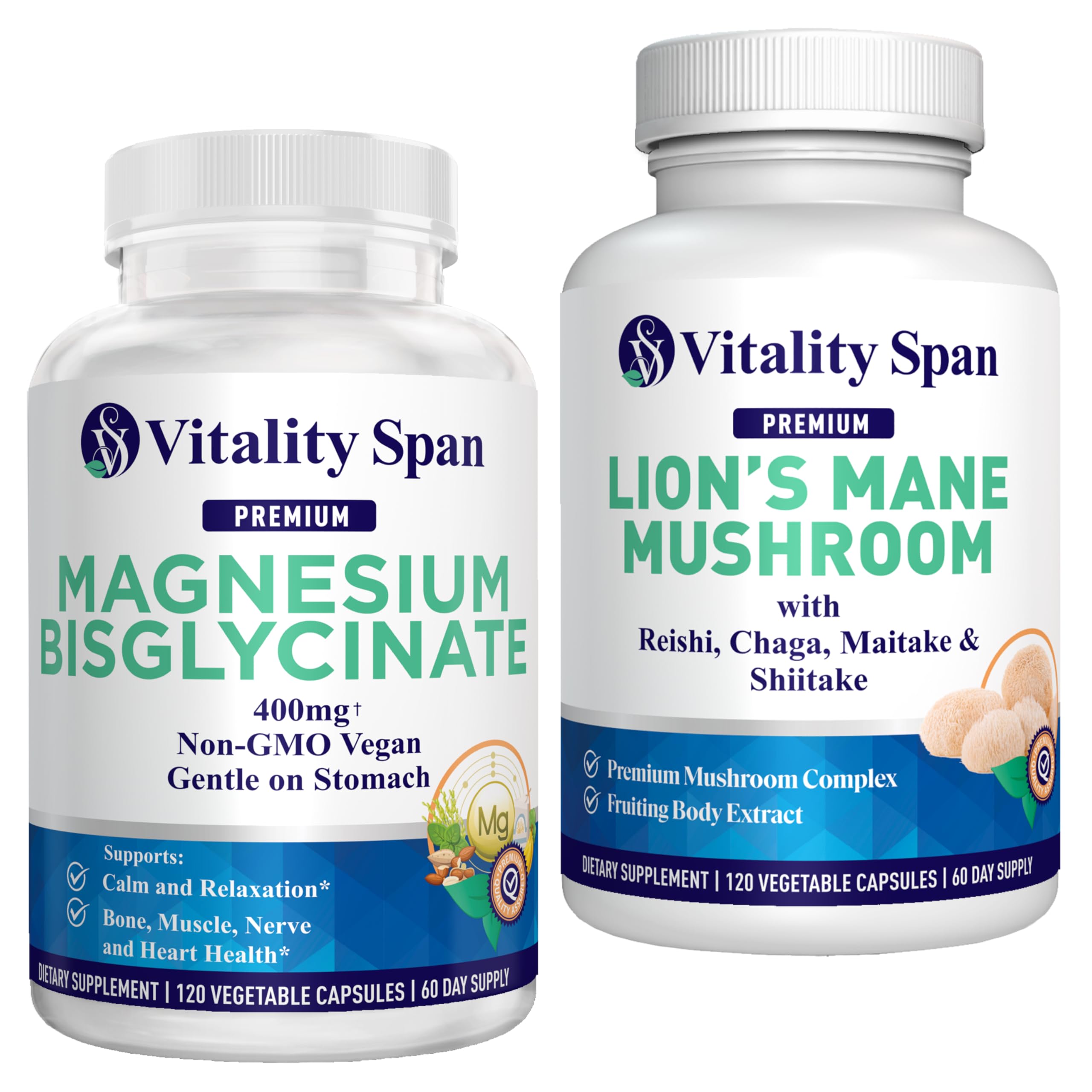 Magnesium Bisglycinate 400mg + Lion s Mane 4:1 Extract Complex Bundle Calm & Relaxation + Focus & Clarity 120 + 120 Veg Capsules, Made in USA