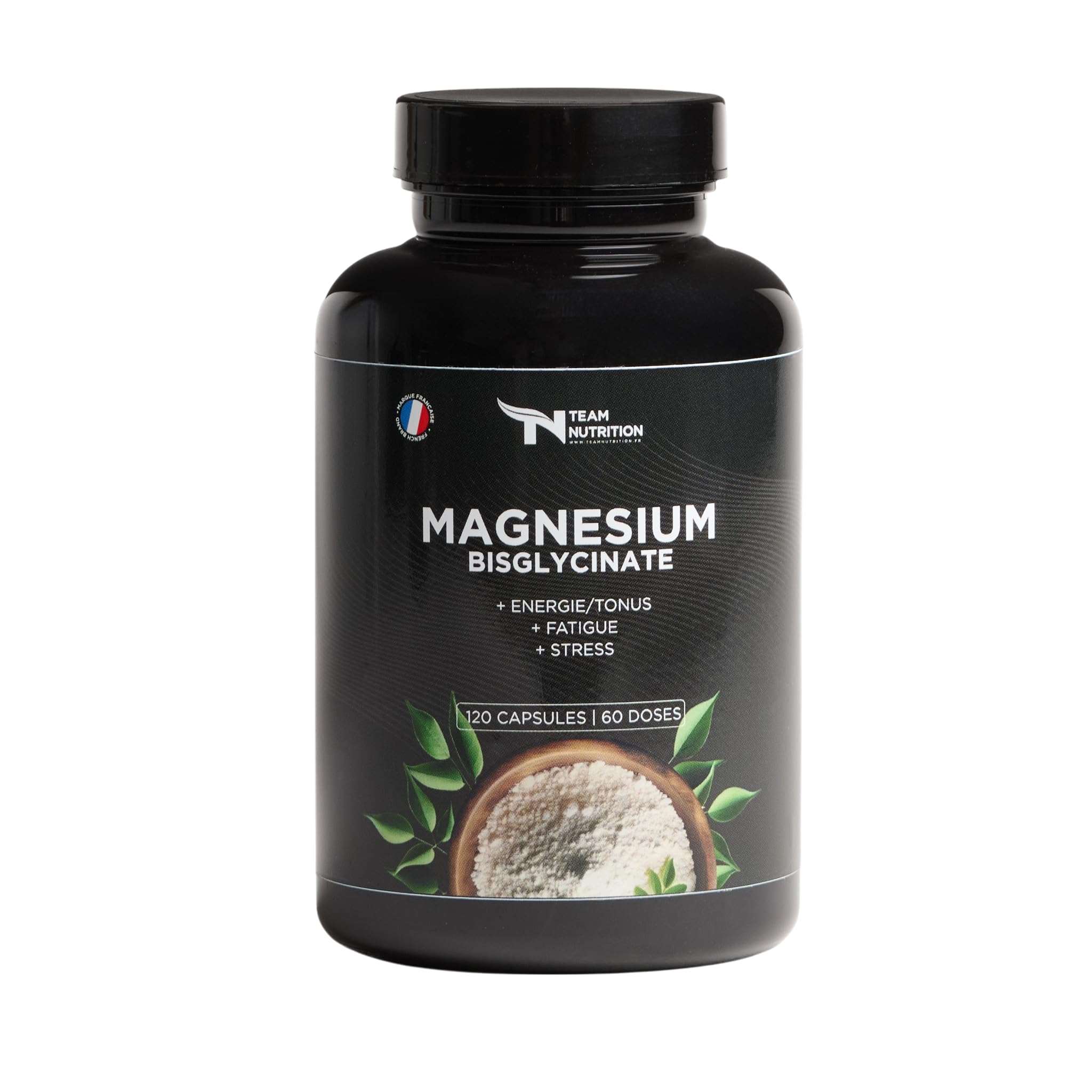 BENEFITS Our Magnesium Bisglycinate goes beyond simple magnesium supplementation. In addition to supporting cardiovascular, muscular, and nervous system health, our formula helps reduce fatigue, improve sleep quality, and strengthen immunity. Enriched with taurine and vitamin B6, our Magnesium Bisglycinate also promotes muscle relaxation and optimal nervous system function, helping you stay calm, focused, and energized throughout the day. Trust Team Nutrition to take care of your well-being, naturally and effectively. CERTIFIED QUALITY SAFETY Committed to excellence and transparency, we are proud to offer you a high-quality product, manufactured to the strictest industry standards. Our Magnesium Bisglycinate undergoes rigorous quality controls to ensure its purity and safety at every stage of production. VERSATILE WELLNESS SUPPORT Whether you're a professional athlete or a sports enthusiast, male or female, our Magnesium Bisglycinate is your perfect ally to achieve your wellness goals. By supporting muscle, nerve, and bone health, our versatile formula helps you feel your best every day. CO-CREATED WITH OUR EXPERTS CONSUMERS Designed in close collaboration with health experts and our valued customers, our Magnesium Bisglycinate meets the specific needs of those seeking effective magnesium supplementation. Our formula is the result of extensive research and a commitment to excellence. HIGH QUALITY OPTIMAL BIOAVAILABILITY Magnesium Bisglycinate Discover Team Nutrition Magnesium Bisglycinate, the form of magnesium best absorbed by your body. Formulated with natural and high-quality ingredients, this supplement offers exceptional bioavailability for maximum absorption. Ideal for supporting your health and well-being, our magnesium bisglycinate is perfect for those seeking effectiveness and quality. Order now and feel the difference.AVANTAGES Notre Magnésium Bisglycinate va au-delà de la simple supplémentation en magnésium. En plus de soutenir la santé cardiovasculaire, musculaire et nerveuse, notre formule contribue à réduire la fatigue, à améliorer la qualité du sommeil et à renforcer l'immunité. Enrichi en taurine et en vitamine B6, notre Magnésium Bisglycinate favorise également la détente musculaire et le fonctionnement optimal du système nerveux, vous aidant à rester calme, concentré et énergique tout au long de la journée. Faites confiance à Team Nutrition pour prendre soin de votre bien-être, naturellement et efficacement. QUALITÉ SÉCURITÉ CERTIFIÉES Engagés envers l'excellence et la transparence, nous sommes fiers de vous offrir un produit de haute qualité, fabriqué dans le respect des normes les plus strictes de l'industrie. Notre Magnésium Bisglycinate est soumis à des contrôles de qualité rigoureux pour garantir sa pureté et sa sécurité à chaque étape de sa production. SOUTIEN POLYVALENT POUR LE BIEN-ÊTRE Que vous soyez un athlète professionnel ou un amateur de sport, un homme ou une femme, notre Magnésium Bisglycinate est votre allié idéal pour atteindre vos objectifs de bien-être. En soutenant la santé musculaire, nerveuse et osseuse, notre formule polyvalente vous aide à vous sentir au mieux de votre forme au quotidien. CO-CRÉATION AVEC NOS EXPERTS CONSOMMATEURS Conçu en étroite collaboration avec des experts de la santé et nos précieux clients, notre Magnésium Bisglycinate répond aux besoins spécifiques de ceux qui recherchent une supplémentation efficace en magnésium. Notre formule est le fruit d'une recherche approfondie et d'un engagement envers l'excellence. HAUTE QUALITÉ BIODISPONIBILITÉ OPTIMALE Magnésium Bisglycinate Découvrez le Magnésium Bisglycinate Team Nutrition, la forme de magnésium la mieux absorbée par votre corps. Formulé avec des ingrédients naturels et de haute qualité, ce supplément offre une biodisponibilité exceptionnelle pour une absorption maximale. Idéal pour soutenir votre santé et votre bien-être, notre magnésium bisglycinate est parfait pour ceux qui recherchent efficacité et qualité. Commandez dès maintenant et ressentez la différence.