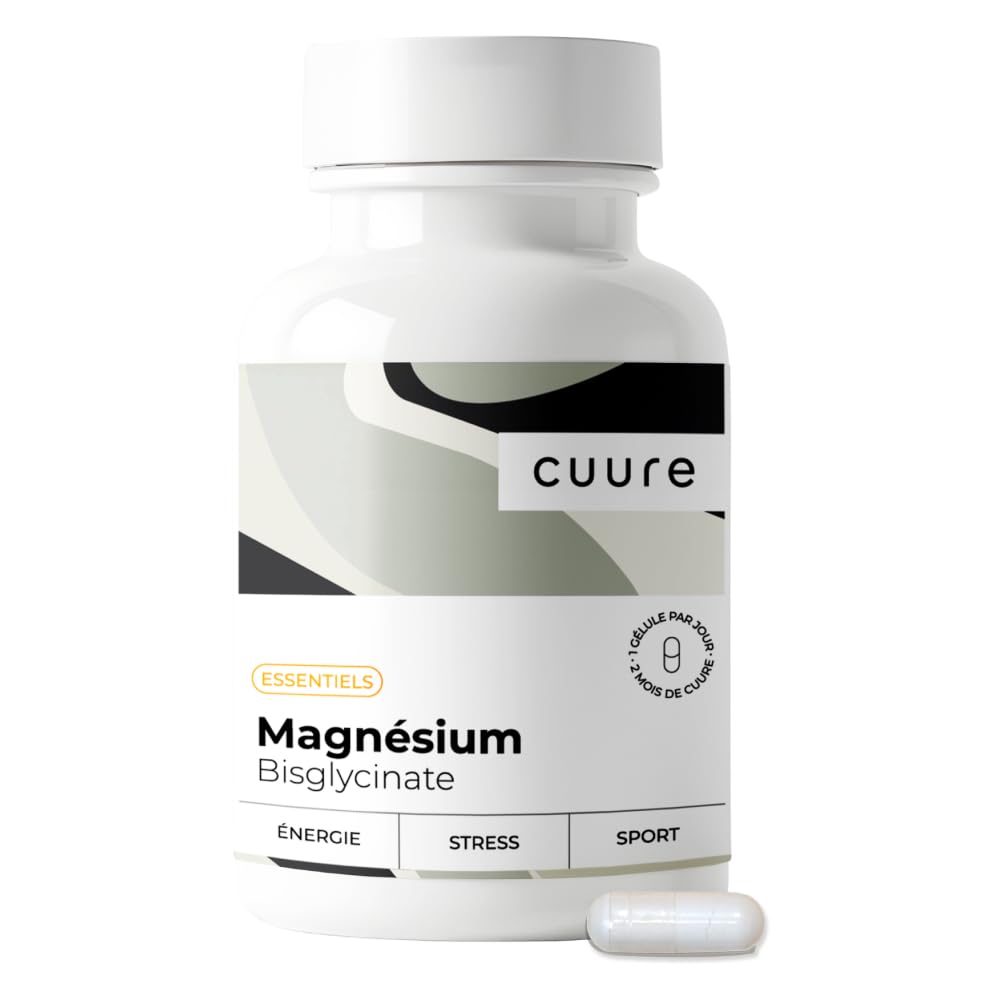 CUURE EXPERTISE All our products are formulated and packaged in France by nutraceutical experts. As the leader in personalized dietary supplements, we strive to meet all needs as effectively as possible, thanks to science and tens of thousands of customer reviews. DIRECTIONS FOR USE Thanks to its high concentration, just one capsule per day (150mg of magnesium and 1.4mg of vitamin B6) provides optimal effectiveness. In case of significant deficiency or after intense exercise, it is possible to double the daily intake to 2 capsules per day. We guarantee the quality of our magnesium by respecting strict European standards. Our magnesium has been rigorously sourced in Germany and developed without GMOs and nanoparticles. HIGH CONTENT AND OPTIMAL BIOAVAILABILITY Each capsule provides 150 mg of Magnesium Bisglycinate, a highly absorbable and gentle form for the stomach. Enriched with vegan Taurine and bio-active Vitamin B6, our supplement guarantees superior absorption for optimal results, without disturbing your digestive comfort. SCIENTIFIC SUPERIORITY OF BISGLYCINATE Unlike conventional forms such as Chloride, Oxide or Marine Magnesium, Bisglycinate is the form that is best absorbed by the body, reducing the risk of digestive disorders while ensuring greater effectiveness. Ideal for maximizing the benefits of Magnesium without compromise. STRESS AND FATIGUE Magnesium is a natural mineral that helps reduce fatigue, limits sleep disturbances, soothes stress, and supports the proper functioning of the nervous system. Ideal for improving tone, concentration, and optimizing muscle recovery. Our Magnesium is perfectly suited for vegans and vegetarians.L'EXPERTISE CUURE Tous nos produits sont formulés et conditionnés en France par des experts nutraceutiques. Leader des Compléments Alimentaires Personalisés, nous nous attachons à répondre à tous les besoins les plus efficacement, grâce à la science et aux dizaines de milliers de retours de nos clients. CONSEIL D'UTILISATION Grâce à sa concentration élevée, une seule gélule par jour (150mg de magnésium et 1,4 mg de vitamine B6) fournit une efficacité optimale. En cas de carence importante ou après un effort intense, il est possible de doubler la prise journalière à 2 gélules par jour. Nous garantissons la qualité de notre Magnésium en respectant les normes européennes strictes. Notre Magnésium a été rigoureusement sourcé en Allemagne et élaboré sans OGM et nanoparticules. HAUTE TENEUR ET BIODISPONIBILITÉ OPTIMALE Chaque gélule apporte 150 mg de Magnésium Bisglycinate, une forme hautement absorbable et douce pour l'estomac. Enrichi en Taurine végane et en Vitamine B6 bio-active, notre complément garantit une absorption supérieure pour des résultats optimaux, sans perturber votre confort digestif. SUPÉRIORITÉ SCIENTIFIQUE DU BISGLYCINATE Contrairement aux formes classiques comme le Chlorure, l'oxyde ou le Magnésium Marin, le Bisglycinate est la forme qui est la mieux absorbée par l'organisme, réduisant les risques de troubles digestifs tout en assurant une meilleure efficacité. Idéal pour maximiser les bienfaits du Magnésium sans compromis. STRESS ET FATIGUE Le Magnésium est un minéral naturel qui favorise la réduction de la fatigue, limite les troubles du sommeil, apaise le stress, et soutient le bon fonctionnement du système nerveux. Idéal pour améliorer le tonus, la concentration, et optimiser la récupération musculaire. Notre Magnésium convient parfaitement aux véganes et végétariens.