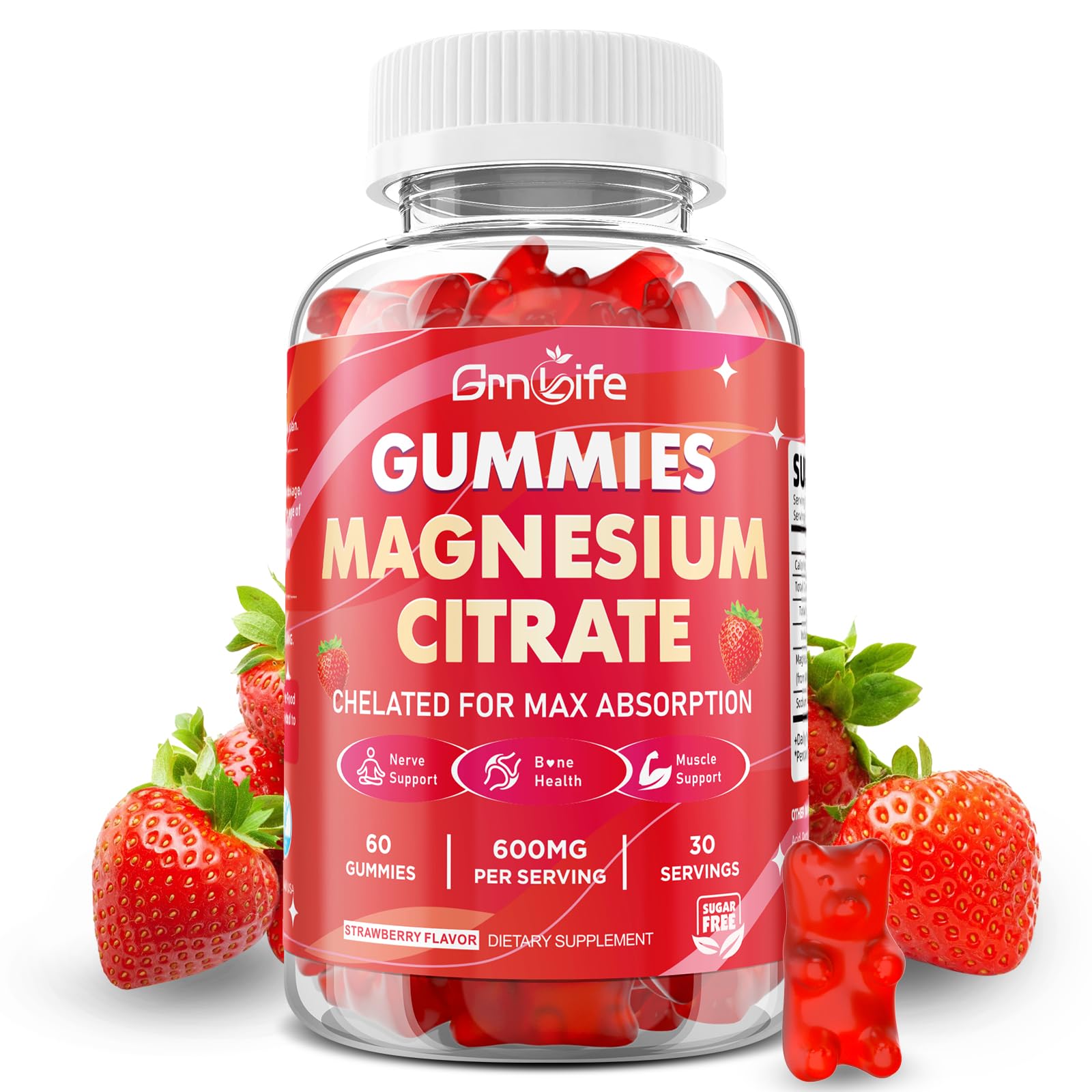 Excellent in Quality: Grnlife Magnesium Citrate Gummies comply with GMP standards and have passed laboratory testing. All batches of the product undergo quality assurance at every stage of production. We are always committed to producing the highest quality dietary supplements and being your health partner. Ideal for Men and Women: The chewable magnesium gummies are suitable for both men and women. They have a comfortable texture after chewing and can be swallowed without water or food, allowing for quick absorption by the digestive system and gentle on the stomach. Each bottle contains 60 gummies, providing a 30-day supply. Support Relaxation Calm: Our magnesium supplement gummies help maintain normal muscle function, relieve muscle tightness and cramps, and also help you stay calm and improve Zzz quality. High-Absorption Magnesium Gummies: Magnesium Citrate is highly soluble in water, making it easy for the body to absorb these magnesium chews. Formulated for superior absorption, helping your body efficiently utilize magnesium for optimal results. 600MG Magnesium Citrate Supplement: Each serving delivers a potent, highly bioavailable 600 mg of magnesium citrate to support your daily wellness needs.