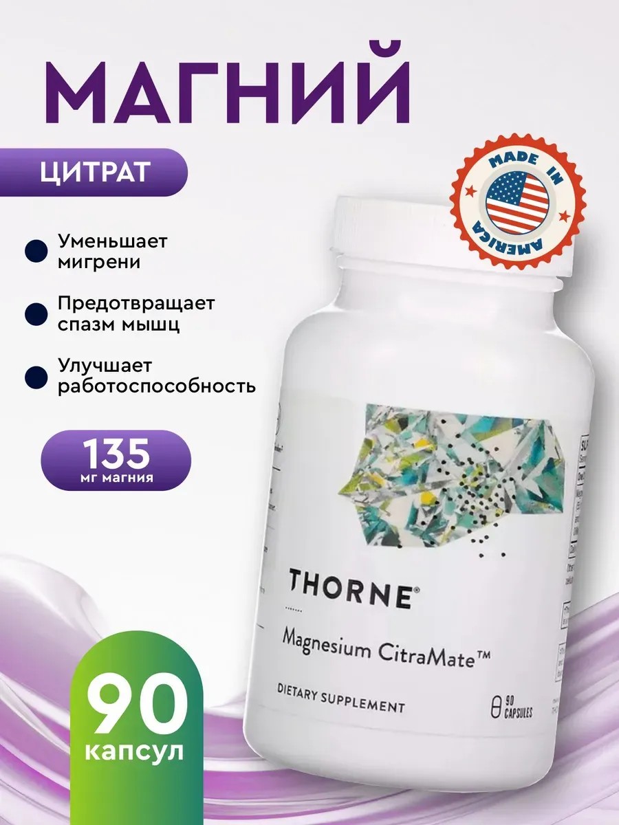 Рекомендации по применению: Принимать по одной капсуле 1-3 раза в день. Перед применением рекомендуется проконсультироваться с врачом. Цитрамат магния в капсулах от Thorne Research — это эффективное средство для поддержки организма взрослых мужчин и женщин. Этот бад разработан с учетом современных требований к правильному питанию и является оригинальным продуктом из США. Благодаря высокой биодоступности, бисглицинат магния обеспечивает отличную переносимость и максимальную пользу для здоровья.