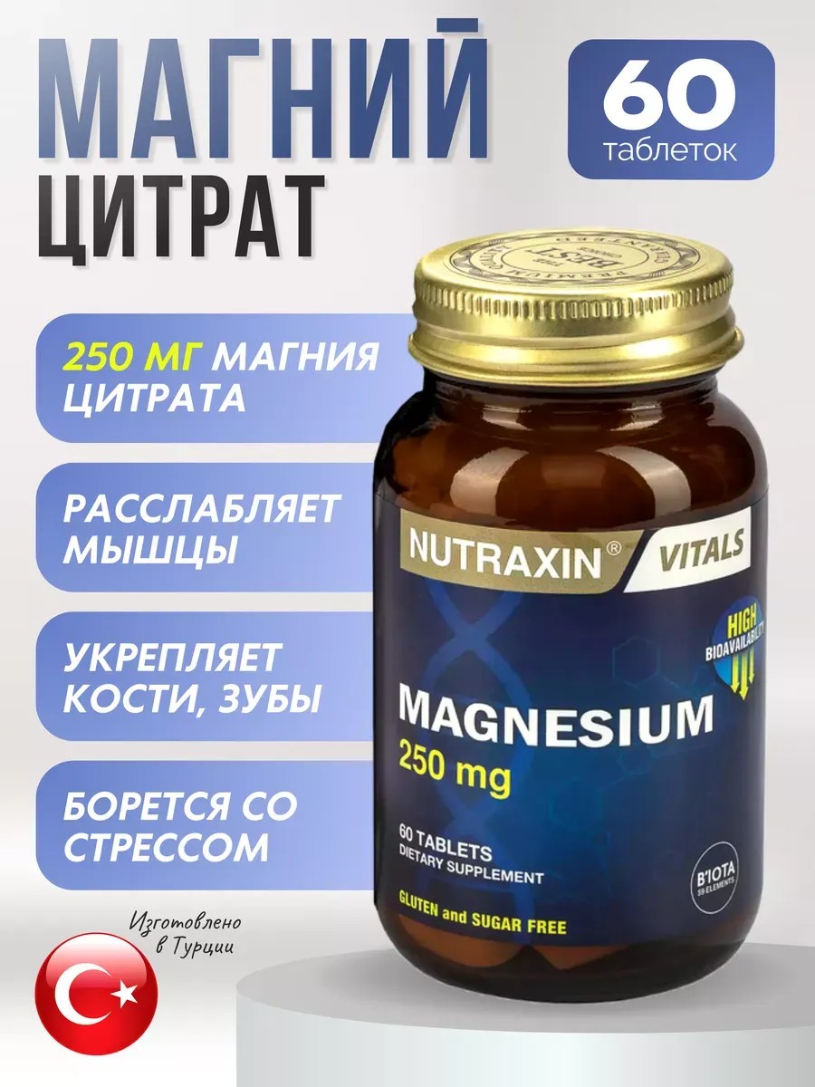 Магний Нутраксин повышает уровень энергии и бодрости. Улучшает работу мозга и нервной системы. Снижает частоту заболеваний, укрепляет защитный барьер организма. Положительно влияет на общее самочувствие. Отличная профилактика осенне-зимней хандры, депрессии, тревожности, нарушений сна. В каждой таблетки содержится 250 мг комплекса. Для увеличения дозировки до 500 мг рекомендуем принимать по 2 таблетки. Цитрат - одна из органических форм минерала, которая отличается высокой усвояемостью, играет важную роль в поддержке здоровья сердца и сердечно - сосудистой системы, защищает нервную систему от перевозбуждения. Магний в6 способствует усвоению основных важных микро и макро - элементов. Magnesium регулирует основные метаболические процессы в теле. БАД важен для нервной и сердечно-сосудистой систем, поэтому его принимают при депрессии. При дефиците появляются мышечные спазмы и судороги, тревога, бессонница, усталость и онемение конечностей, как первые симптомы недостатка. Витамины от стресса имеют оптимальную дозировку и поэтому подходят людям любого возраста. А при аритмии витамины их используют как успокоительные препараты. Магне для женщин нормализует уровень гормонов и укрепляет иммунитет. Если женщину беспокоит нервозность, то можно применить для сна витамины, так как витамин активирует процессы торможения. Мы гарантируем качество турецкого фармацевтического завода Nutraxin и осуществляем прямые поставки .
