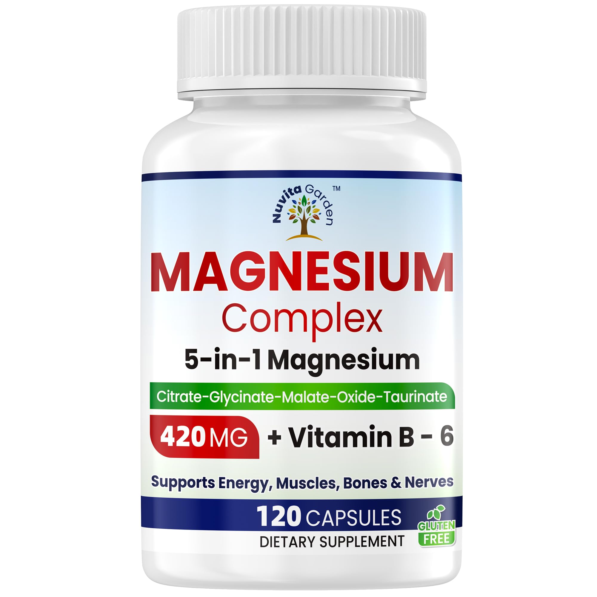 Magnesium Complex 420mg - 5 in 1 Magnesium Supplement with Glycinate Citrate Malate Oxide Taurinate 30mg Vitamin B6 Magnesium Relaxation,Sleep,Muscle,Energy Heart Support, Vegan 120 Capsules