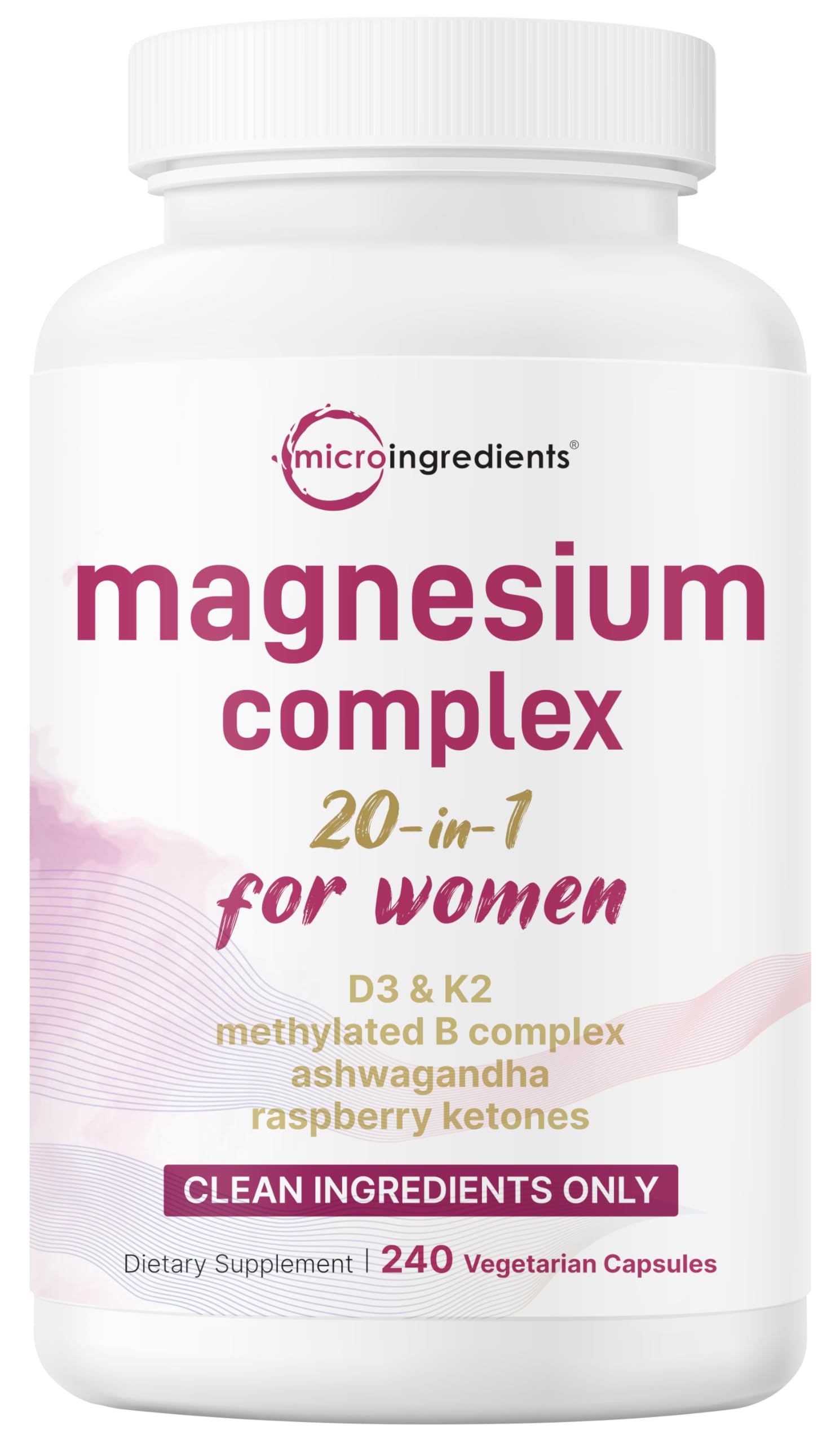 Magnesium is an essential mineral involved in many natural processes throughout the body and is commonly included in daily supplement routines. This 20-in-1 magnesium complex blend is formulated with various magnesium sources, combined with vitamin D3, vitamin K2, ashwagandha, and more to create a comprehensive mineral blend. Delivered in vegetarian capsules, this formula offers a convenient way to incorporate a broad range of magnesium forms into everyday use without fillers or unnecessary additives.These statements have not been evaluated by the FDA. This product is not intended to diagnose, treat, cure, or prevent any disease. Premium non-GMO magnesium supplement. Made without fillers, soy, dairy, wheat, gluten, and tree nuts. Ingredients must pass a 3rd party lab test to ensure our product is safe, pure, and potent. Magnesium is an essential mineral involved in hundreds of natural processes throughout the body, and this 20-in-1 formula combines a comprehensive magnesium complex with vitamin D3, vitamin K2, methylated B-complex, ashwagandha, raspberry ketones, inositol, and additional complementary ingredients in one convenient blend. Every serving delivers an 800 mg magnesium complex sourced from a wide range of elemental, chelated, and purified forms, offering a diverse magnesium composition in one formula. Each bottle provides 240 vegetarian capsules, a serving size of two capsules daily, providing a total of 120 servings designed for consistent routine use. Micro Ingredients offers a Magnesium Complex for Women, featuring a 20-in-1 formulation combining multiple magnesium forms with vitamin D3, vitamin K2, ashwagandha and more, in a vegetarian capsule-based format.